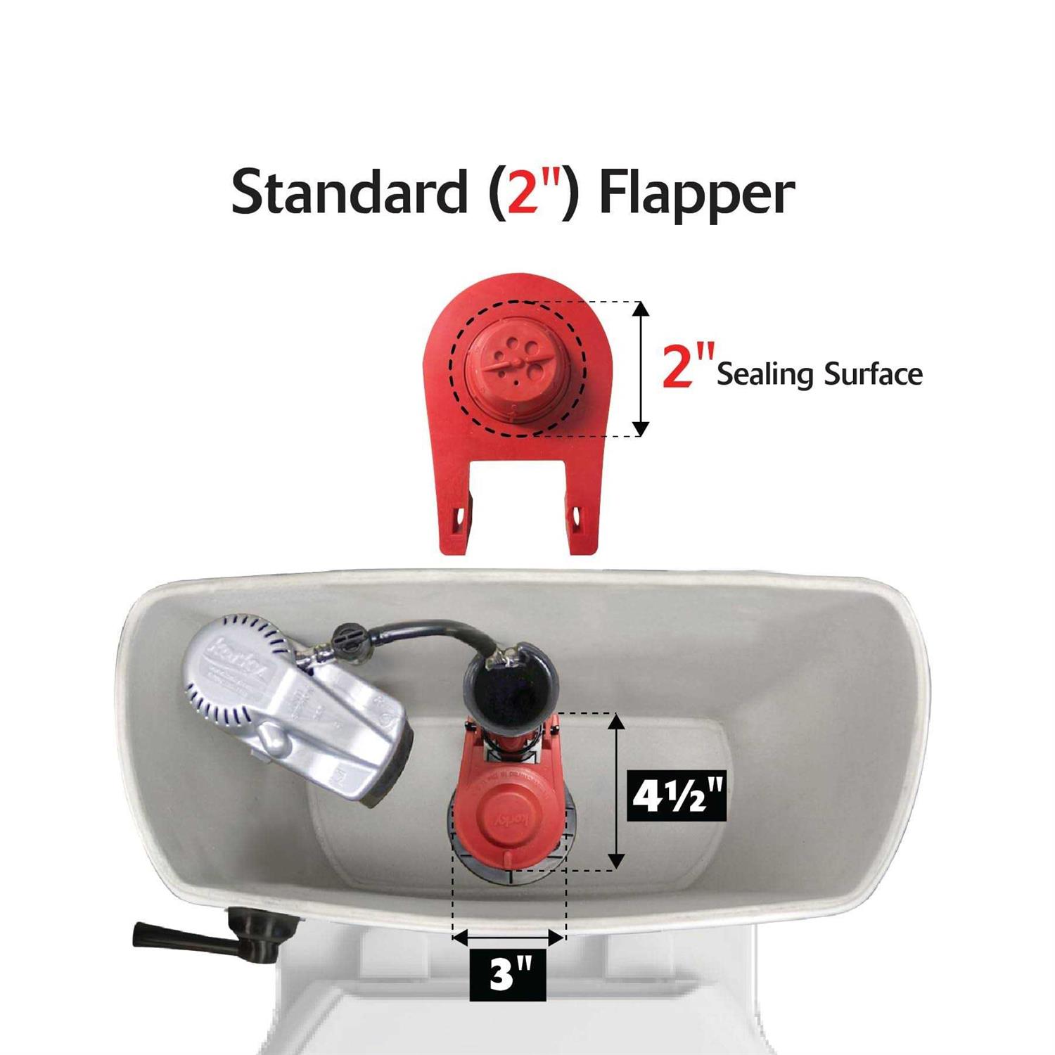 Korky red rubber resists chlorine, bacteria, city water treatment, hard water and well water. The toilet flapper adjusts to match original toilet settings and eliminates water waste by decreasing the amount of water flushed. Ideal for all standard 2 in toilets, including 1.28, 1.6, 3.5 and 5 gpf. The adjustable toilet flapper has multiple settings to ensure it fits popular 2 in toilet models. Made of flexible rubber for a tight seal and easy to install.