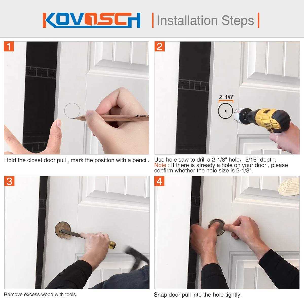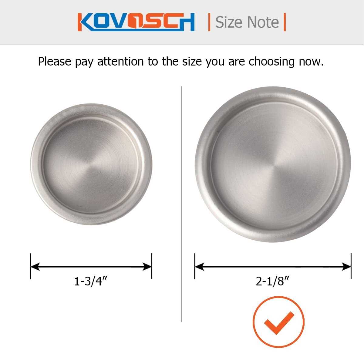 UNIVERSAL: These stamped steel mortise cup pulls are designed for use on universal by-passing sliding panel closet door of closets and furniture.. EASY INSTALLATION: Easy and quick snap-in installation (No Nails Required). The door pulls fits a 5/16 depth x 2-1/8 diameter opening hole.. FREE OF SHARP EDGE: The surface and all edges of KOVOSCH finger pull are finely chamfered with hand polished by hours, it touches soft, smooth and quality feeling.. DURABLE: KOVOSCH closet door finger pull is made of stamped steel to outlast years of use..,,KOVOSCH