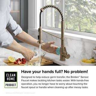 Engineered with hands-free activation, the Bolden Sensor Faucet allows you to turn water on and off with the wave of a hand without touching the handle or spout, helping reduce germ transfer during messy tasks like preparing raw foods. The sensor sits on the side of the faucet to help prevent accidental activation, with a built-in timer that stops the flow after 3 minutes to help prevent water waste. The 2-function pull-down sprayhead with Reach technology offers an extended range of motion, and switches from aerated stream to spray for any kitchen task. Heavy-duty construction helps ensure long-lasting use. Comes with batteries, pre-attached water lines, and mounting hardware for ease of installation. Available in multiple finishes, including spot-free options.