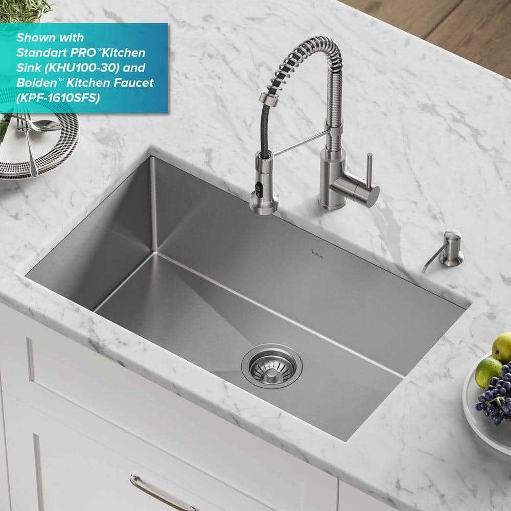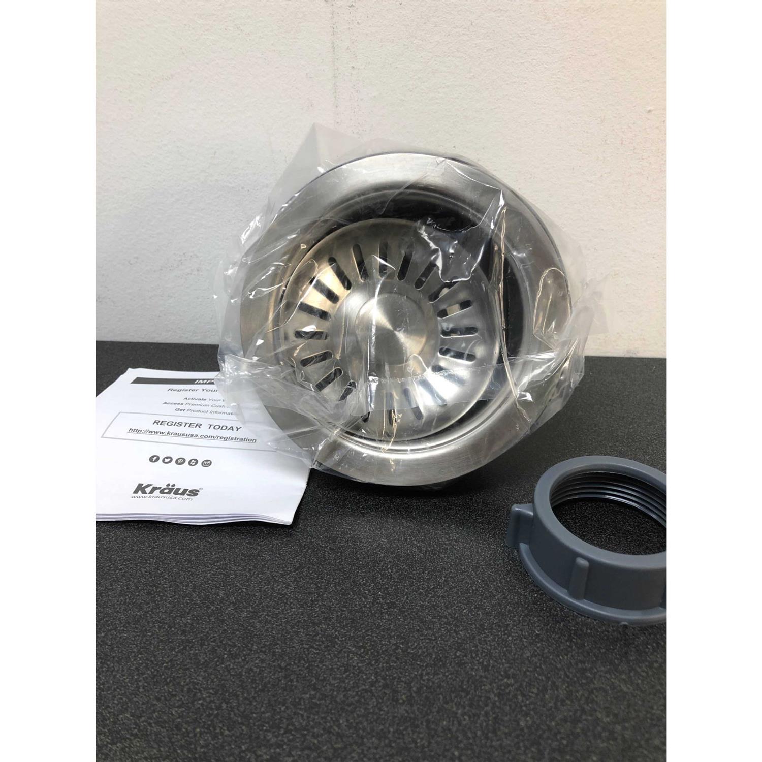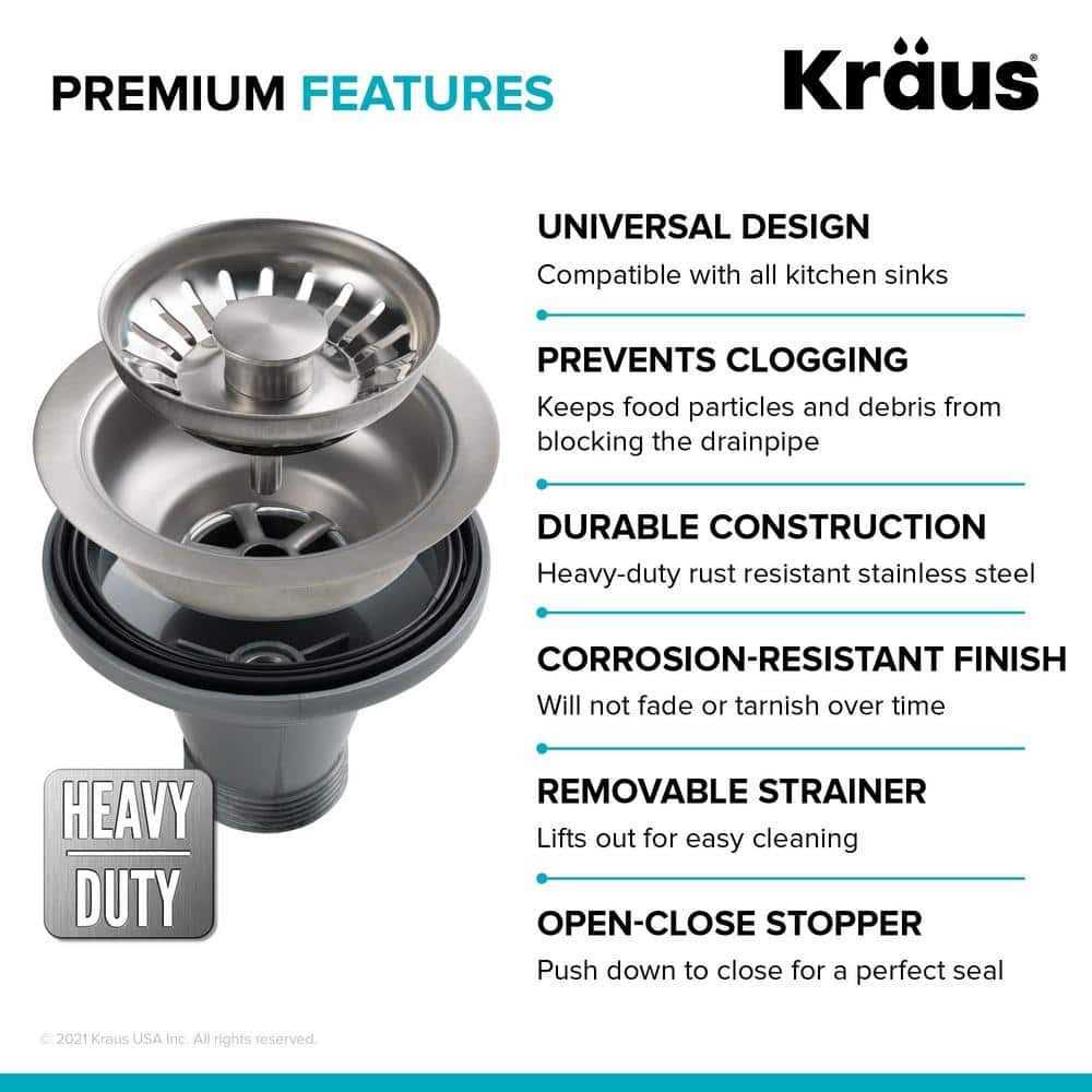 Kraus kitchen accessories provide everyday functionality with style. Constructed from durable rust-resistant T304 stainless steel for long-lasting performance, this heavy-duty kitchen sink drain assembly fits all sinks with a standard 3-1/2 or 4 in. drain opening. This essential accessory enhances the look and functionality of any sink, with quick and easy DIY installation that’s completely mess-free – no plumber’s putty required. The sleek removable strainer traps food particles and debris to prevent your drainpipe from clogging, and lifts out for easy cleaning. An open/close stopper allows you to tightly seal the drain opening so that you can fill up the sink bowl for soaking dishes or deep cleaning. Wear-resistant satin finish creates a clean look with all stainless steel sinks, and complements fireclay sinks, granite composite, enamel, and cast iron kitchen sinks. The universal design is compatible with all standard size sink drains and garbage disposals. Kraus offers kitchen accessories in a variety of colors and styles; from protective bottom grids with commercial-grade durability, to cutting boards and multi-purpose roll-up dish drying racks that will enhance the way you use your workstation sink, to soap dispensers that match your kitchen faucet for that perfect final touch.