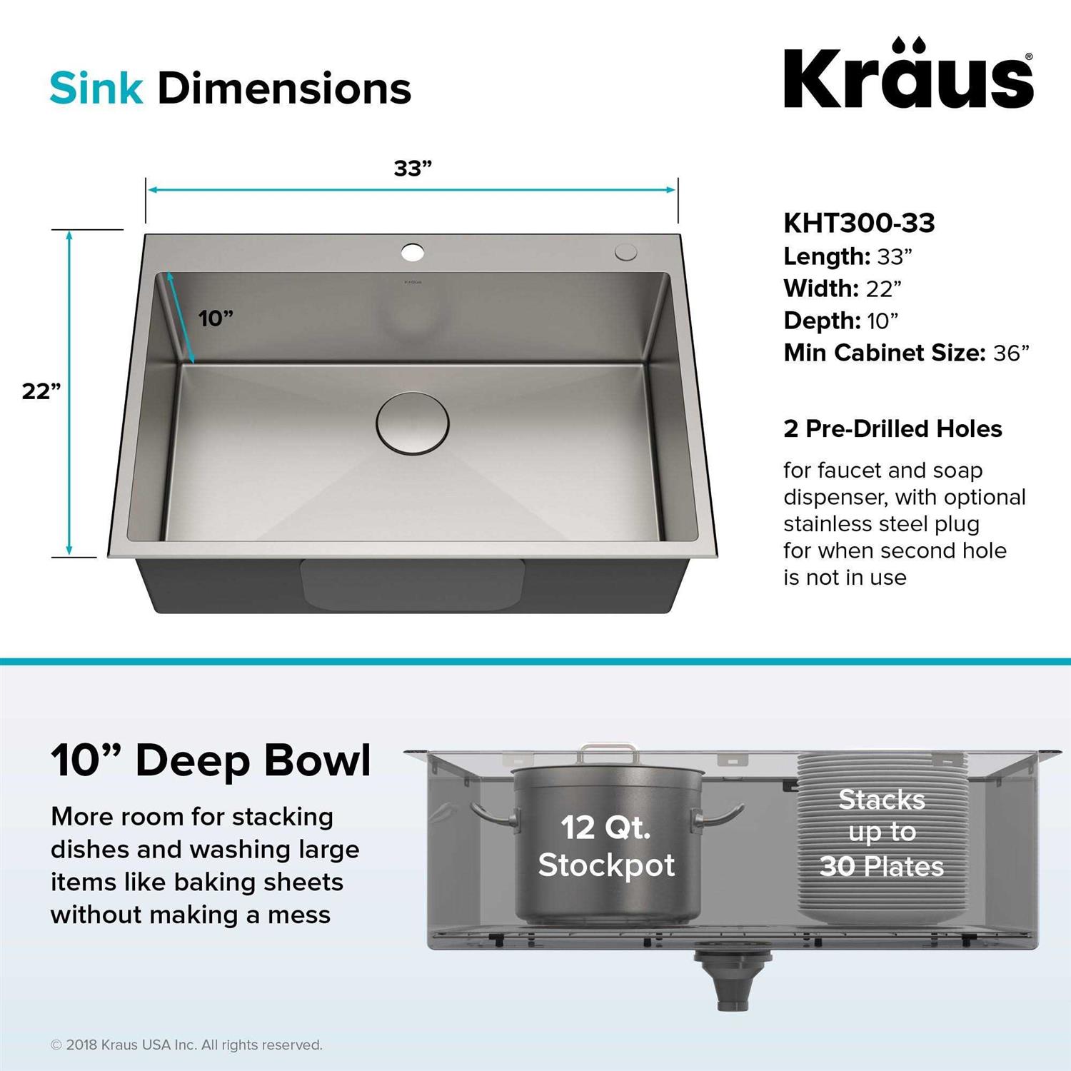 KRAUS’s Standart PRO sinks are known for their outstanding quality. This stainless steel kitchen sink is designed with straight walls and tight-radius corners to create a contemporary look in any kitchen. This 33 Drop-In, or Top mount kitchen sink, come with two holes one for your faucet, and another for an optional soap dispenser.