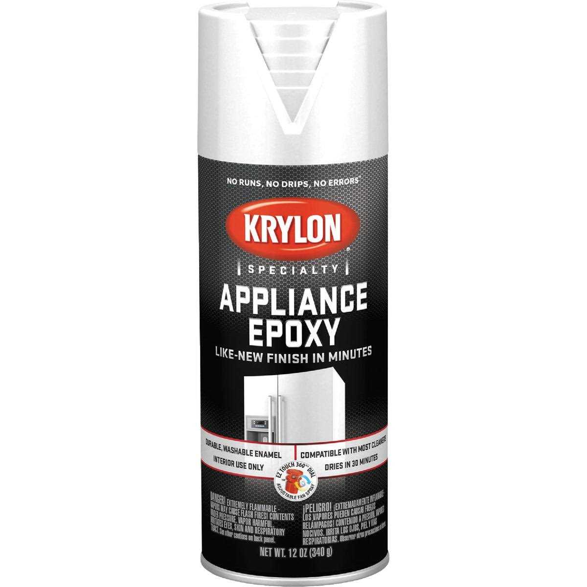 - Krylon Appliance Epoxy Gloss White provides a like new finish in minutes for aged appliances such as refrigerators, washers and dryers