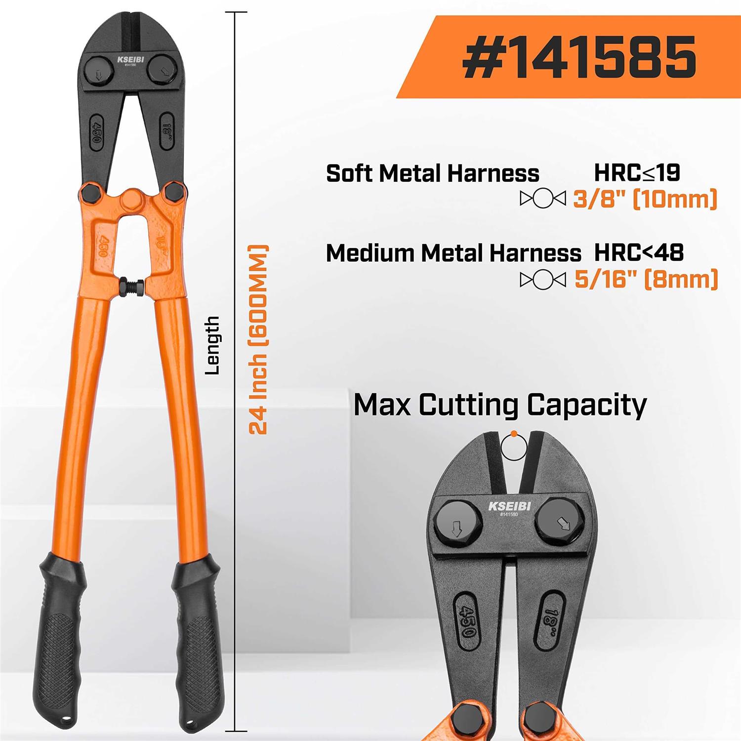 The KSEIBI Bolt Cutters, the ultimate tool for all your cutting needs. Designed to tackle chains, padlocks, bolts, wire mesh, and threaded rods, these bolt cutters make cutting effortless and efficient. Crafted with high-quality materials, the KSEIBI Bolt Cutters deliver exceptional durability and long-lasting performance. The sturdy steel blades provide maximum cutting power and reliability, ensuring they can handle even the toughest cutting tasks. With their compound cutting action, these bolt cutters require less effort while delivering increased cutting force. You can effortlessly cut through various materials, saving time and energy on every job. Safety and comfort are paramount. The long handles provide a comfortable grip, allowing for extended use without discomfort or fatigue. The non-slip PVC coated handles ensure a secure hold, promoting safe operation during use. The KSEIBI Bolt Cutters offer excellent versatility with a cutting capacity that handles bolts, chains, and threaded rods up to HRC≤42: 5/16-inch(8mm);HRC<25: 3/8-inch(9.5mm) in diameter. From professional tradespeople to DIY enthusiasts, these bolt cutters are a reliable companion for a wide range of cutting applications.