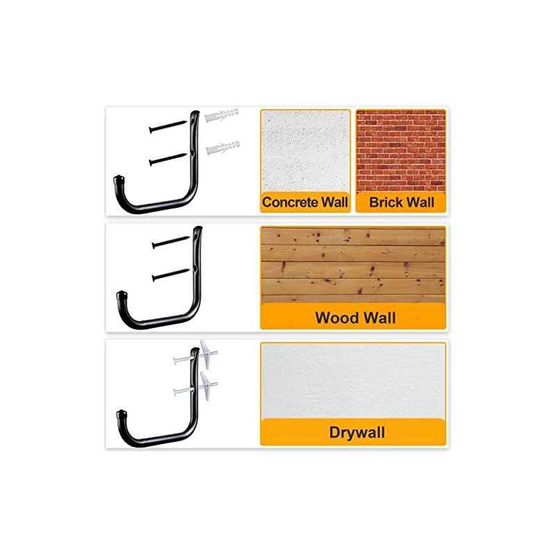 EXCELLENT LOAD-BEARING STRENGTH – our heavy duty ladder garage storage hooks are made of thicker carbon steel with a new bending method, which makes them strong enough to accomplish hanging tasks for heavy objects without bending. This allows them to be used in garages, workshops, and warehouses. PREMIUM MATERIALS – High-quality materials are used in the construction of these utility hooks, which include heavy-duty metal pieces made of high-strength carbon steel. The surface of these hooks has been coated with plastic that has been sprayed on, which makes them very resistant to rust and corrosion. WIDE VARIETY OF USES – Heavy-duty large wall hooks are ideal for hanging a ladder, bike, chair, shovel, stroller, blower, and other objects found in garages, gardens, and homes. Not only do they help you save space in your home, but they also offer a wide variety of uses. EASY INSTALLATION – Installing these garage storage hangers is as simple as turning the screw end against the wood and then tightening it until it is snug on the board. This makes installing garage storage hangers a breeze. It is necessary to pre-drill holes and use anchors when installing shelves on brick walls, concrete walls, or plasterboard walls. KURUI PROFESSIONAL HARDWARE SERIES br KURUI is a professional factory with years of experience in manufacturing daily hardware, tools and fasteners. br br KURUI 4PCS LARGE GARAGE HANGER KIT – Perfect choice for hanging heavy objects on walls, saving room for your house, garage, basement, storage rooms and garden. br br Reasons you should choose KURUI Heavy-Duty Wall Hooks br Premium Material with High Strength br Made of high-quality carbon steel with higher thickness, this garage wall hanger hooks are stronger, sturdier and of higher resistance to bending or breaking. br Highly Resistant to Rust & Corrosion br Finished with spraying plastic coating on the surface, these heavy-duty wall hanger hooks are rust proof and resistant to corrosions. br Easy installation & Wide Compatibility br You can easily mount these wall hanging hooks on wooden walls with screws and nuts, or onto brick walls, concrete walls, etc. with predrilled holes. They can also be installed on drywalls with anchors. br Wide Range of Applications br These high-strength carbon steel wall hanging hooks are perfect for heavy-duty hanging tasks in garages, basements, gardens, storage rooms and more, saving spaces and keep the room neat and tidy. br br PLEASE NOTE br – Please wear gloves to protect your hands while working. br – Please check the package content upon receiving. br br WHAT YOU GET br 4pc Ladder Hooks br 8pc Wood Screws br 8pc Wall Anchors