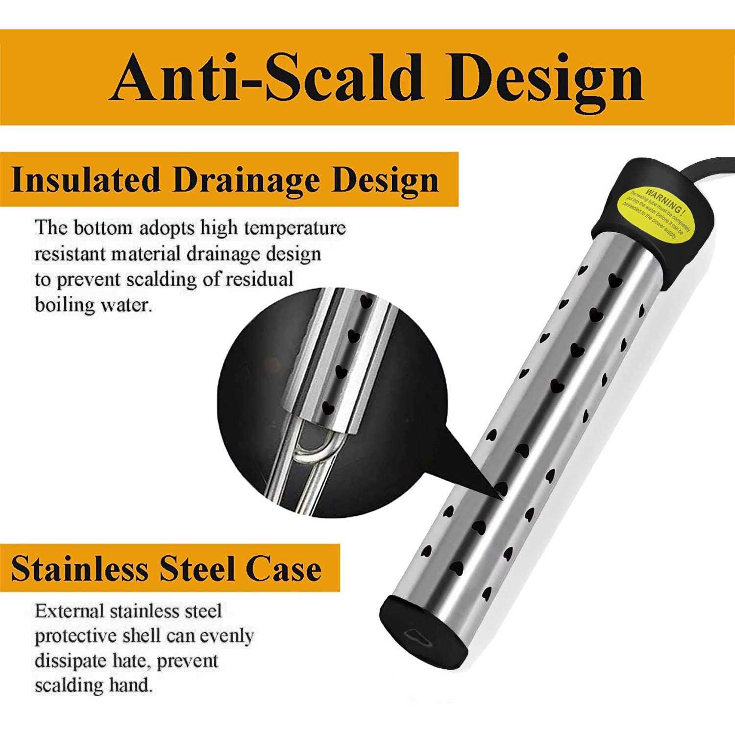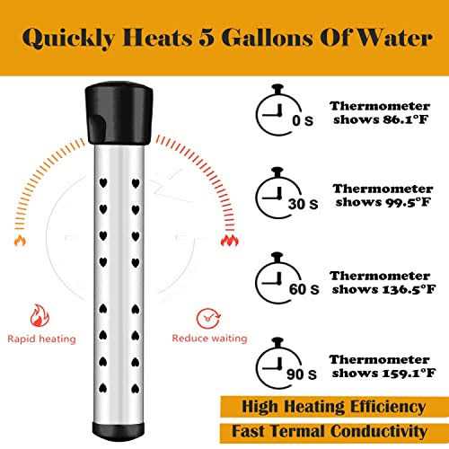 Safe Design:UL certified Instant Water Heater With high quality stainless-steel protect cover,will effectively prevent the heating element is in direct contact with people or animals ,it is rust proof and durable, design for long term use. Our immersion water heater has an intelligent temperature control design, which automatically cuts off the power when the water temperature reached 75°C(165°F). The quality is safe, stable and reliable. Fast Heating:1500W high-power electric water heater can heat up to 5 gallons of water in minutes. Heat dissipates to the water faster by flowing through the holes in the guard. The heater needs to be completely immersed in water in working condition. Please take out the immersion water heater before touching the water! Do not use it for more than 3 hours continuously! Please do not plug the two heaters into the same outlet to avoid fire hazards. Wide Range Of Applications:Our portable water heater is suitable for portable bathtub,mini pool(Using more than one),sink, bucket, washbasin,etc.Make sure the container can hold hot water when using it.This immersion heater is handy and super lightweight, making it perfect for travels and road trips.Note, only for water heating. Easy To Use:Take Electric Submersible water heater immerse in water at proper level,Plug into any grounded 110V AC outlet.with a digital LCD thermometer, easy to measure water temperature. Check power indicator light to make sure immersion water heater is working . Please note: people and animal can’t be in the water while the heater is working. Our portable water heater contains 1* water heater, 1* digital thermometer, 1* stainless steel cleaning ball, 1* instruction manual, This is a gift for friends and family. ul li i Special Reminds /i /b /li /ul p 1. Please do not use it continuously for more than 3 hours!! /b – 2. Please be sure that water in containers submerges the heater!!! /b – 3. It’s forbidden that your body contacts water before unplug the plug! /b – 4. Don’t use extension cord. don’t plug 2 heaters on the same outlet! /b – ul li i Why Choose Our Immersion Water Heater? /i /b /li /ul p – 1. High power for quickly heating, greatly saving your time. – 2. UL-listed for USA and Canada, complies with electrical safety standards. – 3. Widely application, perfect for winter time job. – 4. High quality stainless steel, anti-rust, durable. – 5. Stainless steel guard to prevent scalding of hands. – 6. Heavy-duty water resistant power cord, perfect for indoor and outdoor use. – ul li i Easy to Use /i /b /li /ul p – No any tools are required, just immerse in water at proper level. plug into any grounded wall outlet. Check power indicator light in plug to make sure unit is on. then the immersion heater for water can automatically start heating, easy to use without complex steps. – ul li i Power Indicator Light /i /b /li /ul p – High-quality ground plug with a power indicator light in the plug, you can easily identify if the electric bucket water heater is already working or not. Very user-friendly design. – ul li i Widely Application /i /b /li /ul p – Our bucket heater with thermostat, you can have a wonderful hot shower, wash your pets, heat your farm animals’water in winter, awesome camping necessity, heat a small pool, use for construction industry, animal husbandry, car washing, indoor use and many other jobs in cold weather. – ul li i