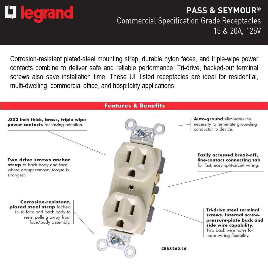 0.032 inch thick, brass, triple-wipe power contacts hold the outlet in place for lasting retention. Impact-resistant nylon face and thermoplastic back body hold up to rough use. Backwire capability with screw-pressure-plate back wiring ensures excellent electrical connections and easy wiring. Auto-ground clip assures positive ground and eliminates the necessity to terminate grounding conductor to device. Terminal compartments are isolated from each other for positive conductor containment. Corrosion-resistant, plated steel strap locked in to face and back body to resist pulling away from face/body assembly. Easily accessed break-off, line-contact connecting tab for fast, easy split-circuit wiring. Accepts a wide range of wiring from #10 – #14 AWG solid or stranded copper or copper-clad conductors. Mounting screws come pre attached to speed installation.