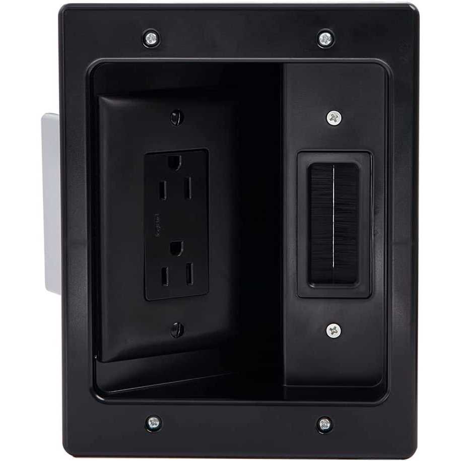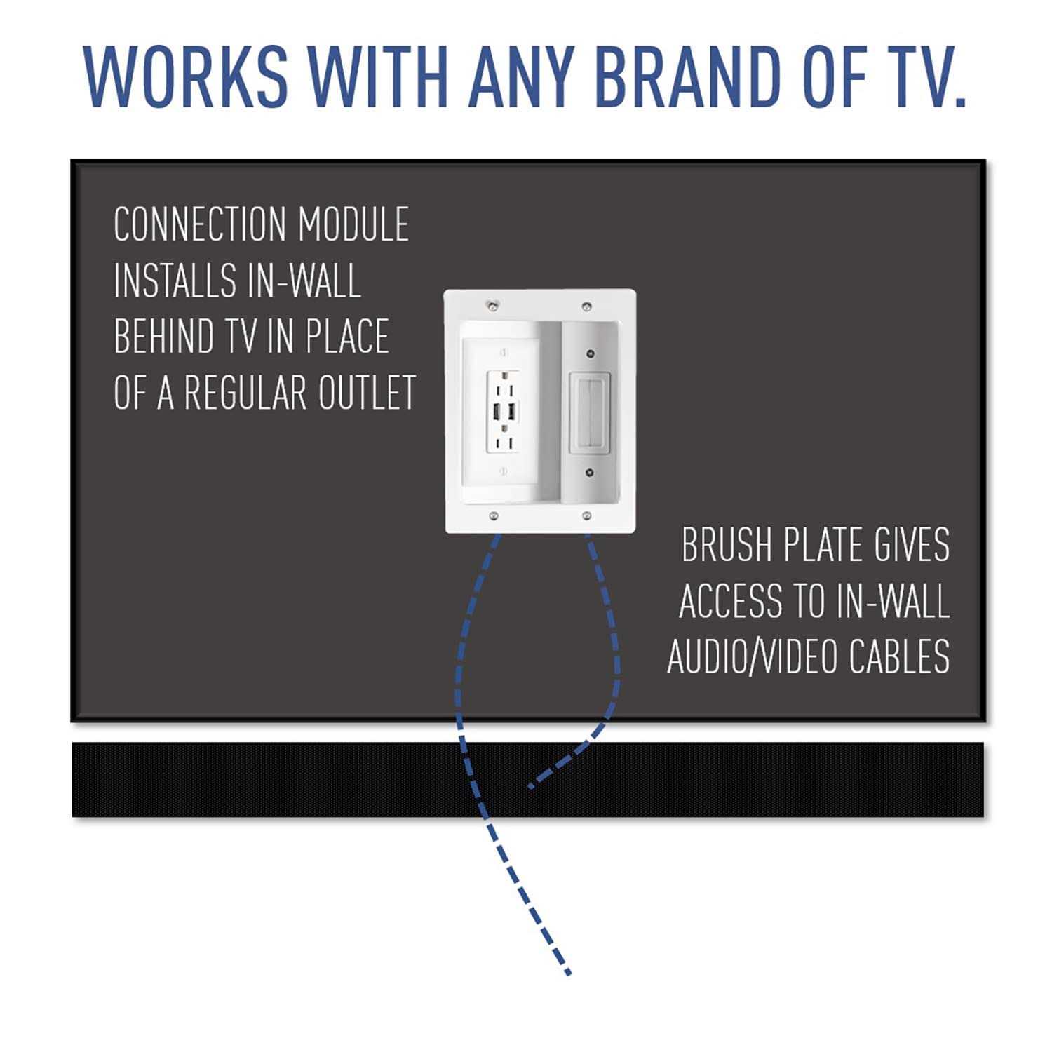 The In-Wall TV Connection Kit provides recessed power and cable management for a wall mounted TV. This kit manages excess cabling via in-wall storage and recessed outlet to allow TVs to mount flush to wall. Compatible with all TV Power plugs, even right angle cords and USB Type A connections. The outlet accomodates power for multiple devices like cable box, soundbar, or streaming player like Roku or Apple TV. Kit includes recessed wall plate with integrated LV brush opening, junction box, 15A tamper resistant outlet and wall plate.