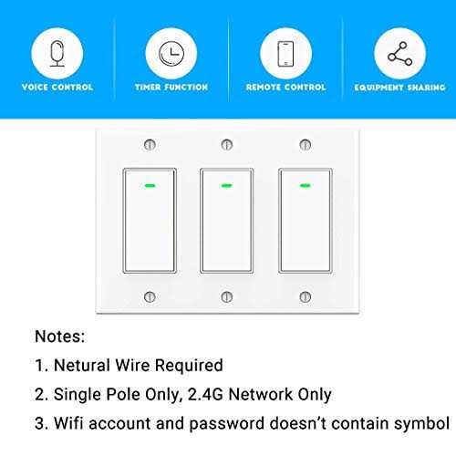 Verify Compatibility: 1. Replaces Single pole switch only. Not compatible with 3- way (multi location control) switch 2. Neutral wire required. 3. Only support 2.4GHz Wi-Fi, not support 5.0GHz Wi-Fi 4. Not compatible with Apple HomeKit, Samsung Smartthings, Nest, Wink, Vivint 5. Your Wifi account and password had better not contain symbol and space 6. Package: three separate switches with one wall plate. The 3-gang wall plate is put in the inner box Note: I