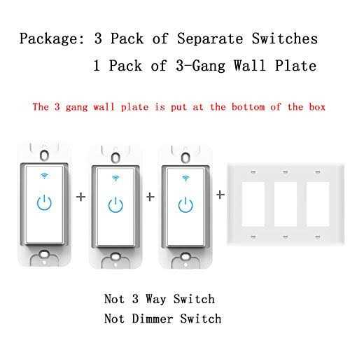 NOTE: Single-pole application only. Neutral wire is required. Only works with 2.4 GHz Wi-Fi network. Package include: three separate switches with one 3-gang wall plate. The 3 gang wall plate is put in bottom of the packing box. TOUCH CONTROL & LED BACKLIGHT: Tempered glass touch screen design,40ms high-speed touch-sensitive response. Blue indicator shows the on/off clearly, easy to find in darkness, but zero-impact on sleep. Low power consumption and long service life. VOICE CONTROL: Smart switch compatible with Amazon Alexa,Google home assistant, just a simply voice command can let Alexa / Google Assistant turn on/off the light for you, free your hands and save time of walking around. SET SCHEDULE & SCENE: Control your lights from anywhere. Secure control using the Smart Life App when you are home or away. Custom schedules and set times, let your lights function automatically. On at sunset, off at bedtime.Create scenes to control a group of lights. GROUP CONTROL & DEVICE SHARING: Create a group in ‘Smart Life’ App, so you can trun on/off all the lights in the same group at the same time, And support control one device via many phones, you can share your smart switch to your family members. Verify Compatibility: /b br 1. Replaces Single pole switch only. Not compatible with 3- way (multi location control) switch br 2. Neutral wire required. br 3. Only support 2.4GHz Wi-Fi, not support 5.0GHz Wi-Fi br 4. Not compatible with Apple HomeKit, Nest, Wink, Vivint br Package: three separate switches with one 3-gang wall plate. Wi-Fi Enabled Smart Light Switch, Control your lights from anywhere br 2. Hands-free lighting control with Amazon Alexa and Google Home br 3. Set your favorite lighting for an entire room with a single touch br 4. Intelligent sharing can be freely shared with family members br 5. Reliable Performance enable you to enjoy the benefit of the smart home technology br br Specifications: /b br Power supply: Neutral + Live wire br Rated Current: 15A br Rated Voltage: AC110V-125V~50/60Hz br Rated Power: INC 1650W(Max) LED 300W(Max) br Wireless Standard: IEEE802.11b/g/n br Working frequency: 2.4GHz br Safety: WEP/WPA-PSK/WPA2-PSK br Encryption: WEP/AES/TKIP br Static power loss: ≤0.5W br Working Temp:-20 C~75 C br Humidity: 95% br Control Distance : no limitation br br Kindly Remind: /b br 1. If you can’t connect to wifi in Easy Mode, please try to connect in AP Mode br Long press the power button until the wifi light blinks slowly, then choose AP mode in smart life app, follow the steps to connect br 2. When you set wifi name and password, please use numeric and letters, don’t use special symbols br 3. To pair with Alexa, google home, please enable smart life skill on your APP br 4. The indicator light will be blue when power on br 5. This is a touch switch, not mechanical switch br