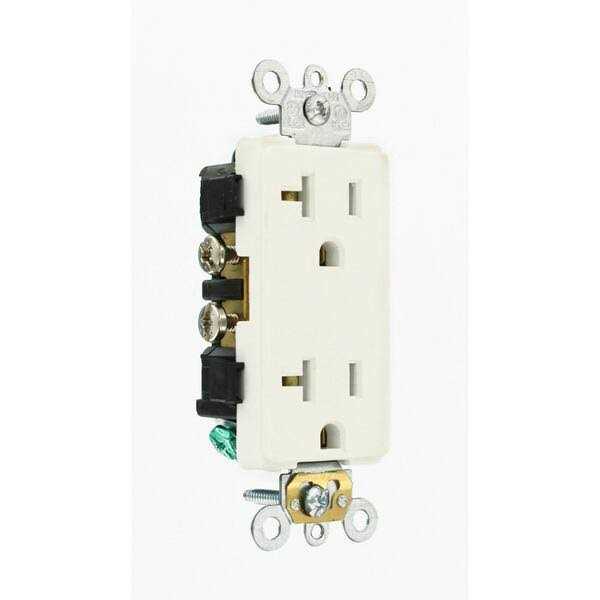 Leviton Decora Plus Straight blade duplex receptacle in white color features a thermoplastic nylon, body and face for impact as well as rust resistance. Commercial grade receptacle has a zinc-plated steel strap, clamp nuts and works at full rated current. It has a current rating of 20 Amps and voltage rating of 125 Volts. The 2-Pole self-grounding receptacle has three-wire circuitry and comes with 0.031-Inch thick brass triple-wipe line contacts. It measures 1.520 Inch x 1.140 Inch x 4.060 Inch.