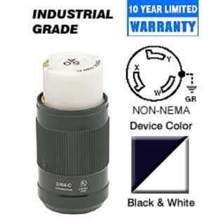 - 50 Amp, 250 Volt DC/600 Volt AC, Non-NEMA, 3P, 4W, Black & White Locking Connector, Industrial Grade, Grounding.