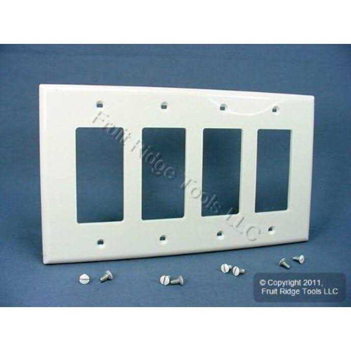 Leviton Decora 4-Gang Screwless GFCI decorator wallplate in white color features a thermoplastic nylon construction for enhanced durability. Mid-size wallplate has a smooth face with rounded edges to avoid accumulation of dust particles/injuries/wall damage. Decorator wallplate measures 8.560 Inch x 4.880 Inch x 0.250 Inch. Wallplate in a sleek, versatile, contemporary design complements any paint/wall covering and has an elegant smooth finishing. It is compatible with GFCI devices. Wallplate in 4-Decora configuration is suitable for residential/commercial applications. Wallplate is UL listed/CSA certified.
