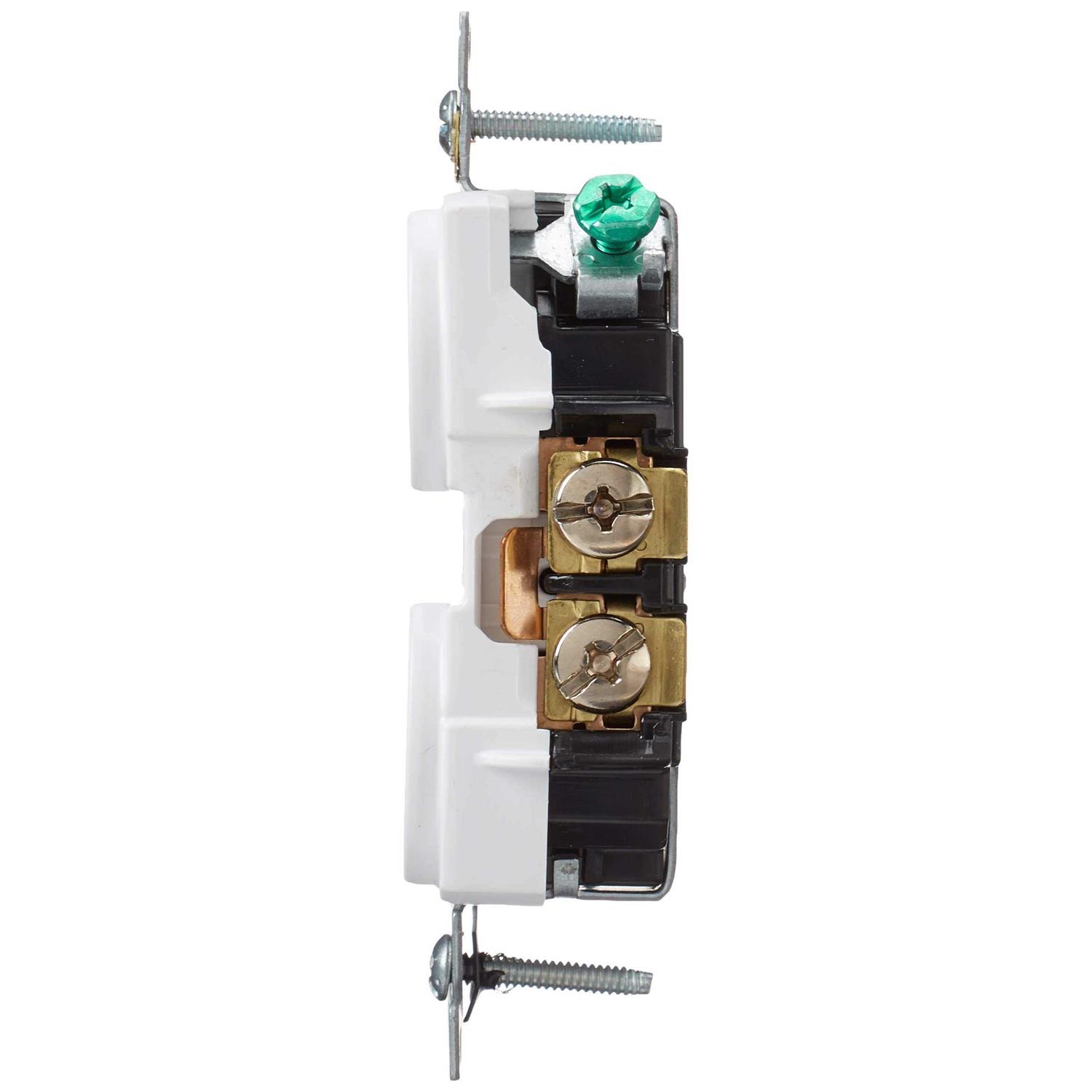 Leviton Duplex self-grounding receptacle in white color is hospital graded for safe and heavy-duty operation. It features nylon body and face for durability. It has back/side wired terminations and galvanized steel strap with riveted ground contact. It measures 1.550 Inch x 1.210 Inch x 4.060 Inch. The 2-Pole receptacle has a current rating of 20 Amps, voltage rating of 125 Volts and power rating of 3 Watts. The three-wire straight blade receptacle has a flame rating of V-2/UL94 and operates at -40 to 60 deg C temperature.