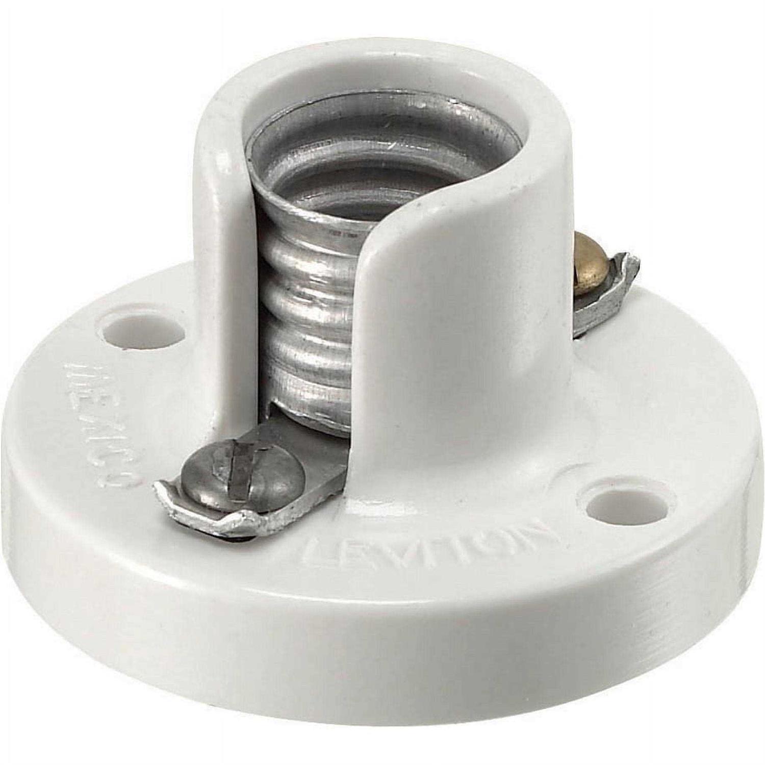 Leviton Keyless incandescent lamp holder in white color features phenolic body construction. It has candelabra base and is of incandescent type. Keyless lamp holder has pony cleat construction and an open terminal connection. It has a voltage rating of 125 Volts and a power rating of 75 Watts.Lamp holder measures 1.438 Inch diameter x 0.875 Inch. Lamp holder is UL/CSA/NOM certified.