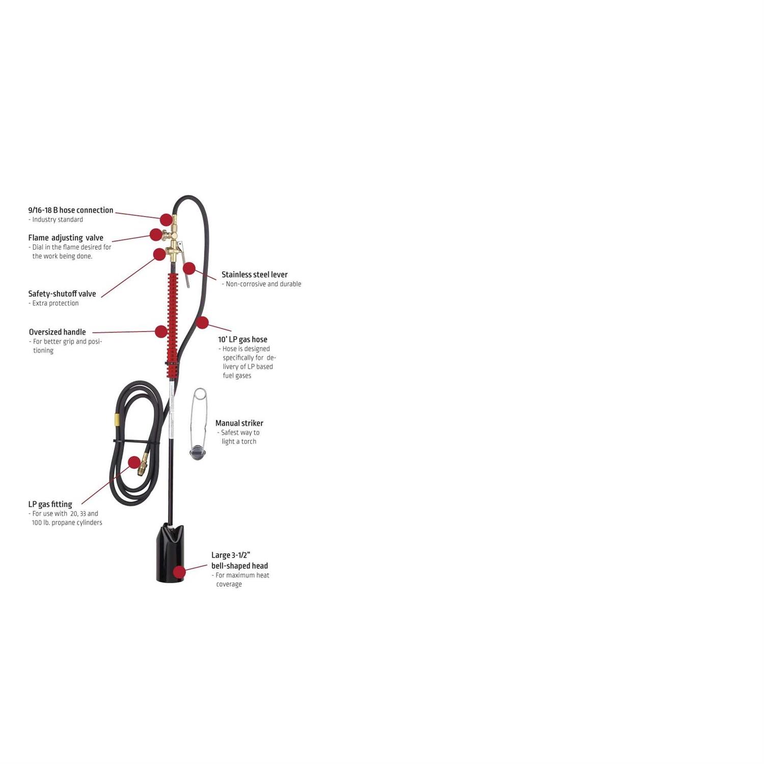 The Lincoln Electric Inferno Propane Torch Kit is heavy duty and great for burning brush and weeds, repairing road surfaces, removing paint, melting tar and asphalt in roofing applications and removing snow and ice. Has quick shutoff valve for safety. Comes with a 10 ft. liquefied petroleum (LP) gas hose striker for up to 350 psig.