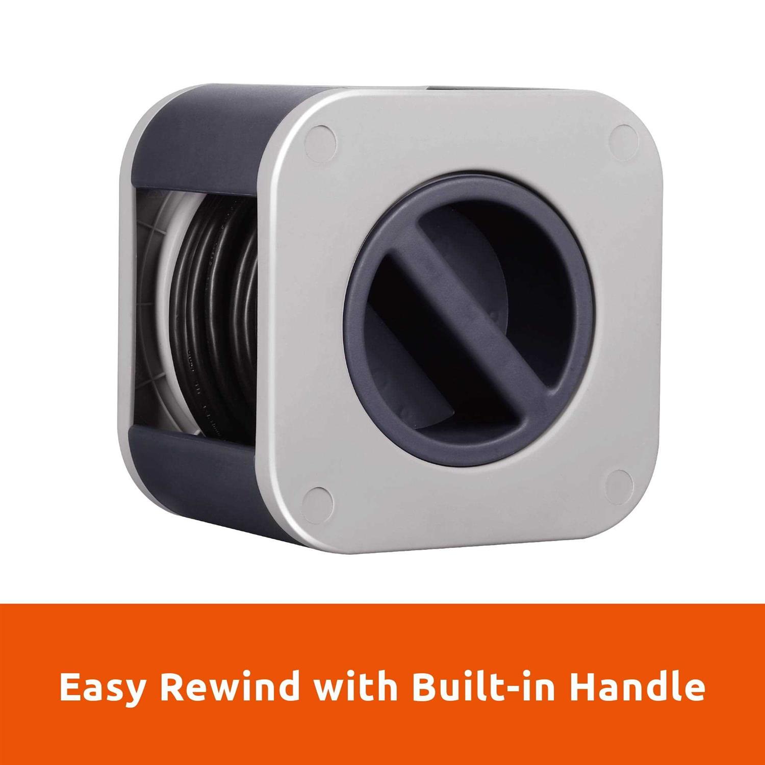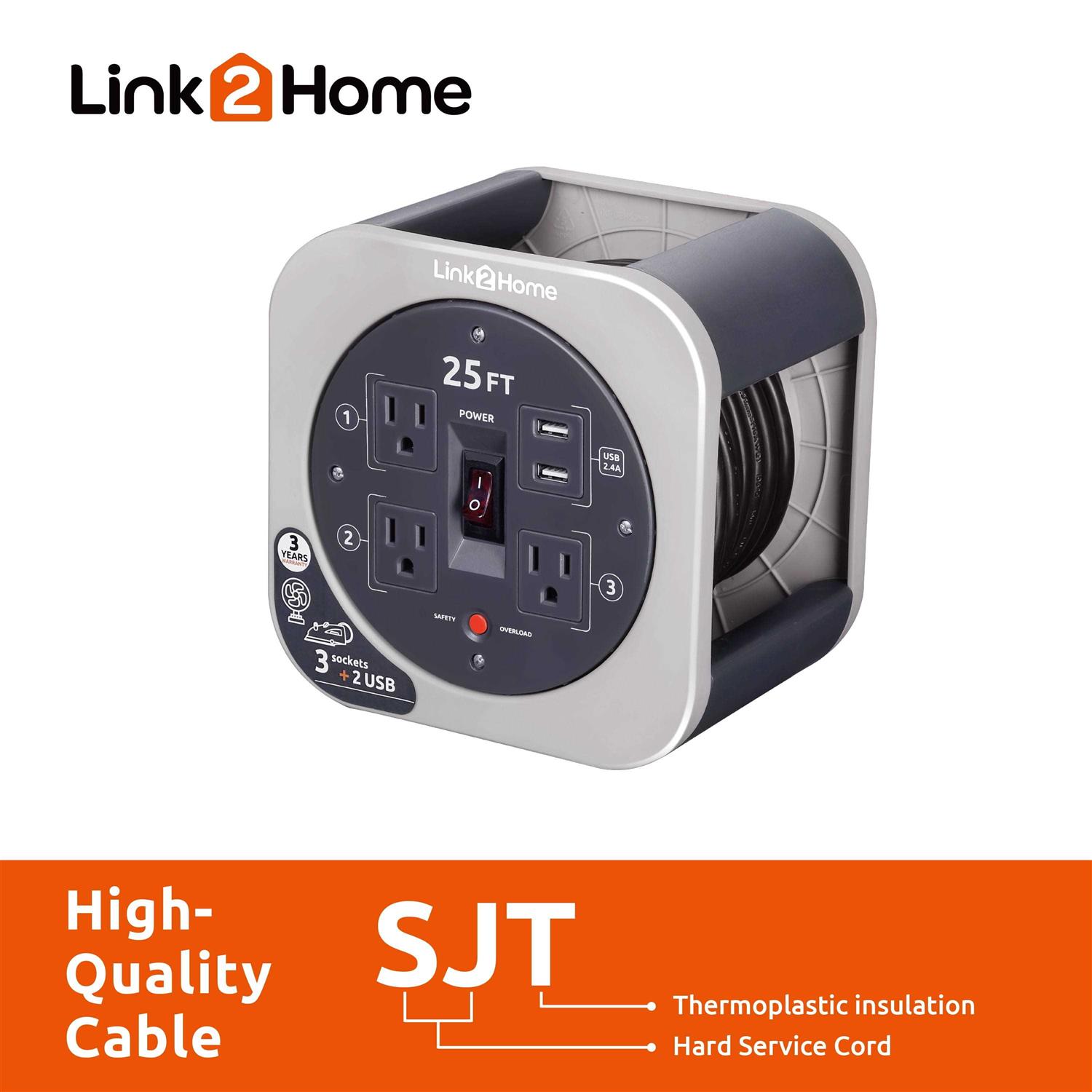 Tangle free cord management; easily winds into reel keeping cords neat and tidy for next use Built-in circuit breaker will automatically protect devices from damage Connect small appliances, devices, tools found throughout the home, office, garage, backyard, etc. Compact and easy to carry; unique four-handle design enables easy transport and compact storage CSA certified. 25ft cord reel. 2.4A fast charge Link2Home Cord Reel 25 ft. Extension Cord 3 Power Outlets, 2 USB Ports, 2.4A Fast Charge with16 AWG SJT Cable is the perfect power solution for your home, garage, backyard, tiny spaces, urban living or office. Tangle free cord management helps cords stay organized and tidy for next use. Extension cord reel features easy grip handle for smooth rewind. Compact design enables easy storage for when not in use. Lightweight four handle design.