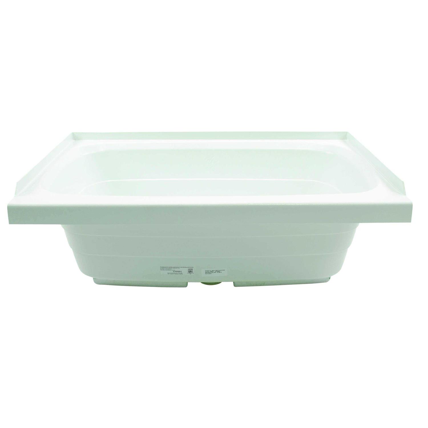 RV bathtub has a front drain hole and a tile flange that prevents your wall from getting water damage. Durable ABS plastic construction is lighter and more eco-friendly than fiberglass. Flat rim around the tub holds soap and other toiletries. The Better Bath name stands for quality, and our bath products have been the quality benchmark for more than fifty years. ABS acrylic bathtub ideal for RVs with space for a full bathtub/bathroom. Classic style and color fits in with most RV color schemes. Perfect for upgrading used RVs. Buy matching Better Bath rivets to complete installation. ABS is 20-25 percent lighter than fiberglass and is better for the environment. The floor or pedestal it sits on must be flat, level, and solid. The pre-installed foam bottom provides a cushy layer of support that prevents cracking, so it shouldn’t be removed or altered in any way. The foam bottom also helps dampen loud sounds. Hardware (not included) is required to attach the bathtub to the floor or pedestal.