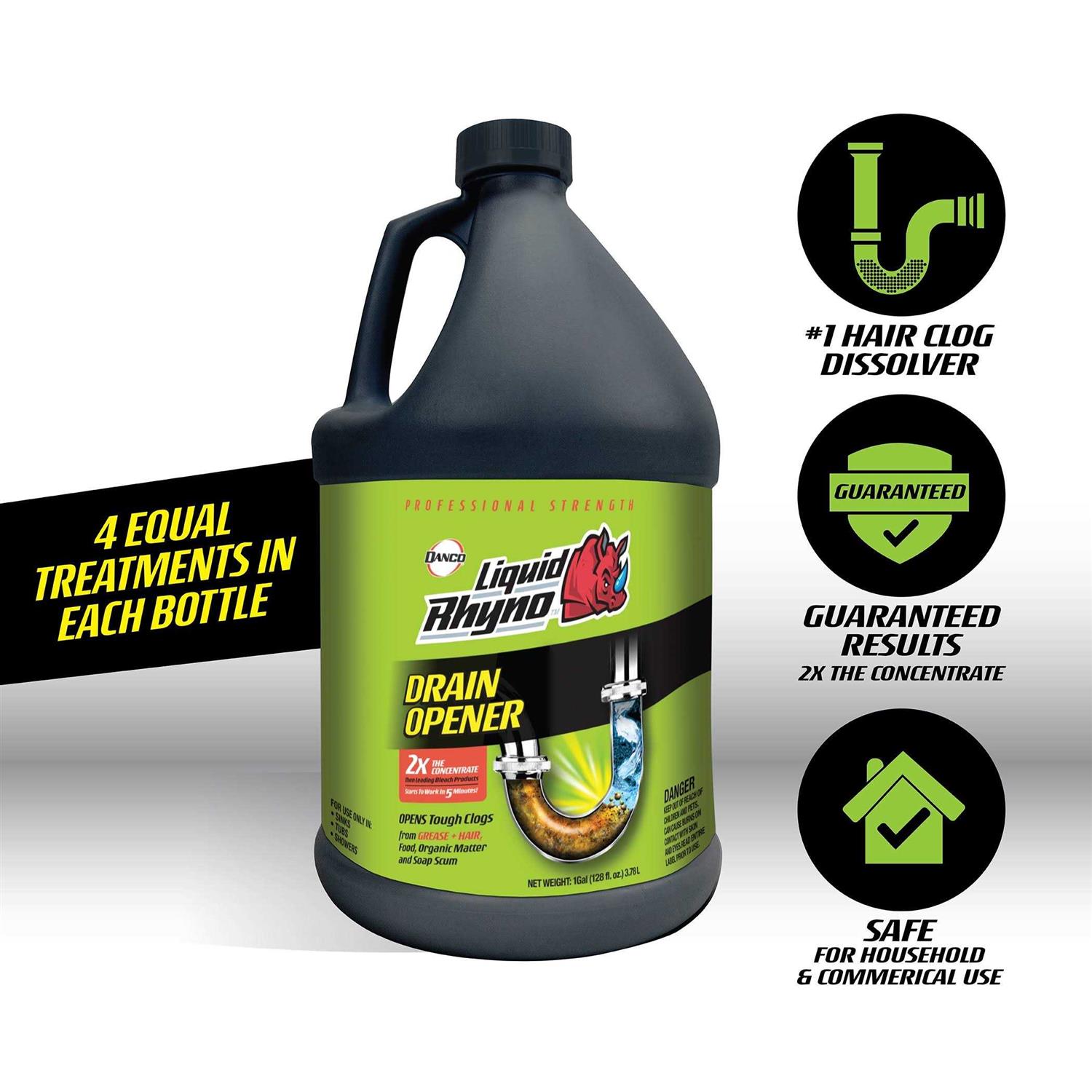 Liquid Drain Opener destroys clogs from human and pet hair to dissolving greasy food, organic matter and soap scum. Liquid Rhyno charges headfirst to bust through clogs and frees slow-flowing drains for both residential and industrial uses. With our 3-step process all you have to do to unclog a clogged drain is pour, wait, and flush with warm water and see results in as little as 5 minutes. Repeat steps if necessary for those thicker long-standing clogs. This product is safe for use in sinks, tubs and showers when used as a drain opener unclogging tough hair clogs it breaks down into salt and water when entering city sewage or septic tank.
