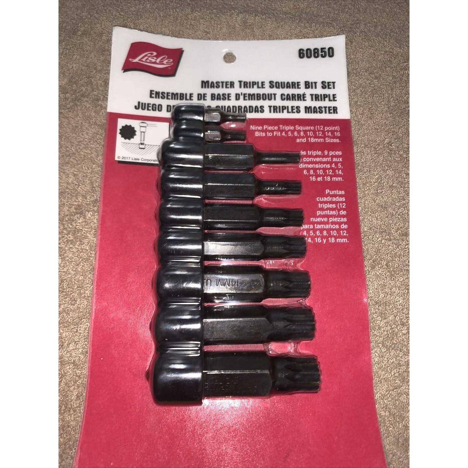 Lisle Lisle 60850 Master Triple Square Set 9 Pc For head bolts, brake caliper bolts, door handle screws, axle bolts and other applications. The 4 and 5mm bits have 5/16hex drive. The 6, 8, 10 and 12mm bits have 1/2hex drive. The 14 and 16mm bits have 5/8hex drive. The 18mm bit has a 3/4hex drive. The three largest sizes are designed to work on tamper-proof applications. For head bolts, brake caliper bolts, door handle screws, axle bolts and other applications. The 4 and 5mm bits have 5/16in. hex drive. The 6, 8, 10 and 12mm bits have 1/2in. hex drive. The 14 and 16mm bits have 5/8in. hex drive. The 18mm bit has a 3/4in. hex drive. The three largest sizes are designed to work on tamper-proof applications.