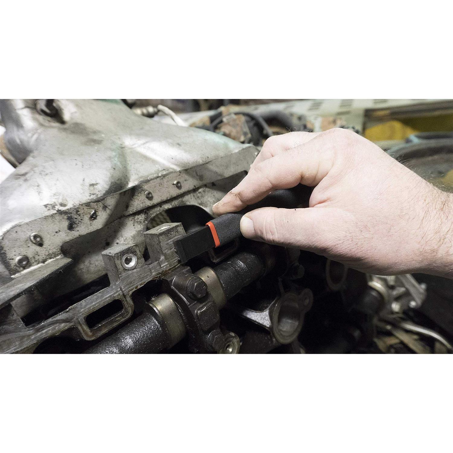 Designed to Remove Gasket Residue from Steel and Aluminum Heads and Manifolds, Along with Carbon Build-Up and Even Rust.The carbide scraper features a shorter and narrower double-dip grip handle. Can be used to clean disc brake caliper slides. The tungsten carbide tip is brazed to the steel blade that is molded into the comfortable 5″ long handle. The tip remains very sharp and is precision ground. Use caution when using scraper on aluminum to avoid scratching the surface.
