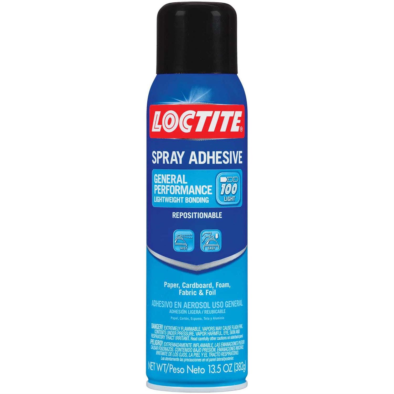 Loctite Spray Adhesive General Performance is a premium quality formulation that dries clear and has a superior bonding strength. It dries quickly and is ideal for a wide range of household and automotive repair projects. Works on a variety of porous and nonporous substrates. This package contains 13.5oz of spray adhesive. WARNING Content under pressure. Conforms to ASTM D 4236. Extremely Flammable. WARNING This product contains chemicals known to the state of California to cause cancer birth defects or other reproductive harm. Do not mouth or chew. Made in the USA.