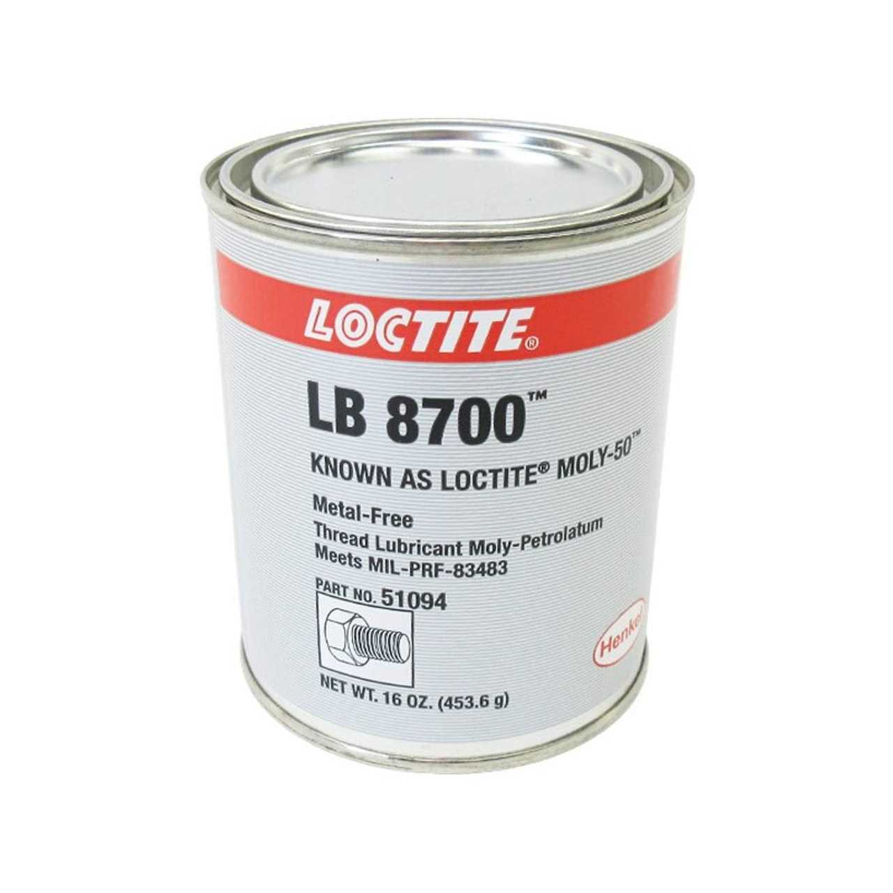 Thread lubricant paste made from molybdenum disulfide and petrolatum for machine threads, tapered pipe threads, for press-fit and slip-fit joints. LOCTITE LB 8700 is a gray, smooth thread lubricant paste formulated from molybdenum disulfide and petrolatum. Can be used on machine threads, tapered pipe threads, for press-fit and slip-fit joints. It is used in applications with an operating range of -20. °F to +748. °F (-29 °C to +398 °C). It has been tested to meet Military Specification MIL-PRF-83483 (This is a regional approval).