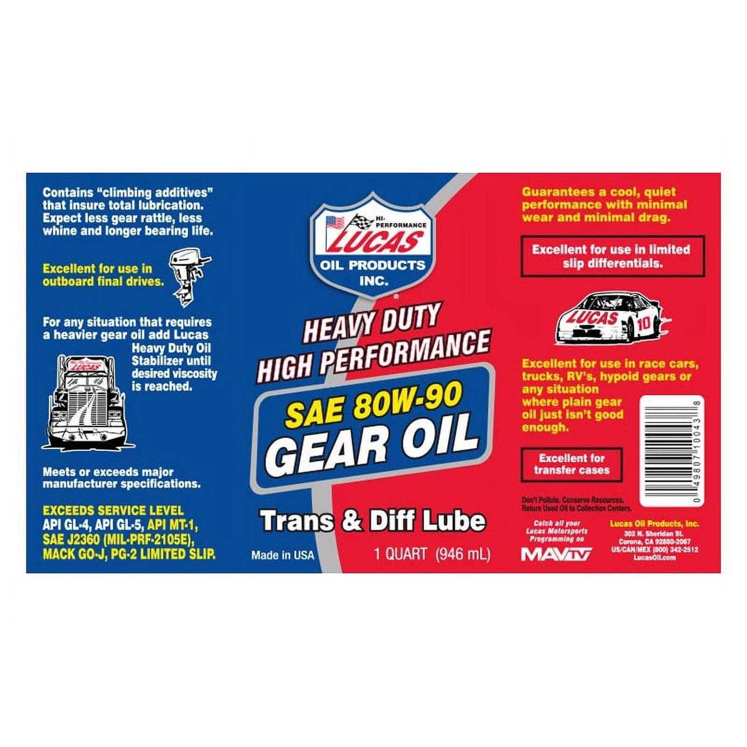 Gear oils have needed improving for years, especially in the high performance industry. The Lucas 80W-90 enjoys the technology Lucas developed in making the “Lucas Heavy Duty Oil Stabilizer”, the number one supplemental oil in the heavy duty industry. This gear oil formula is fortified with special anti-wear agents and lubricity agents to control wear and drag as well as special additives to control heat. These features are not found in ordinary gear oils.