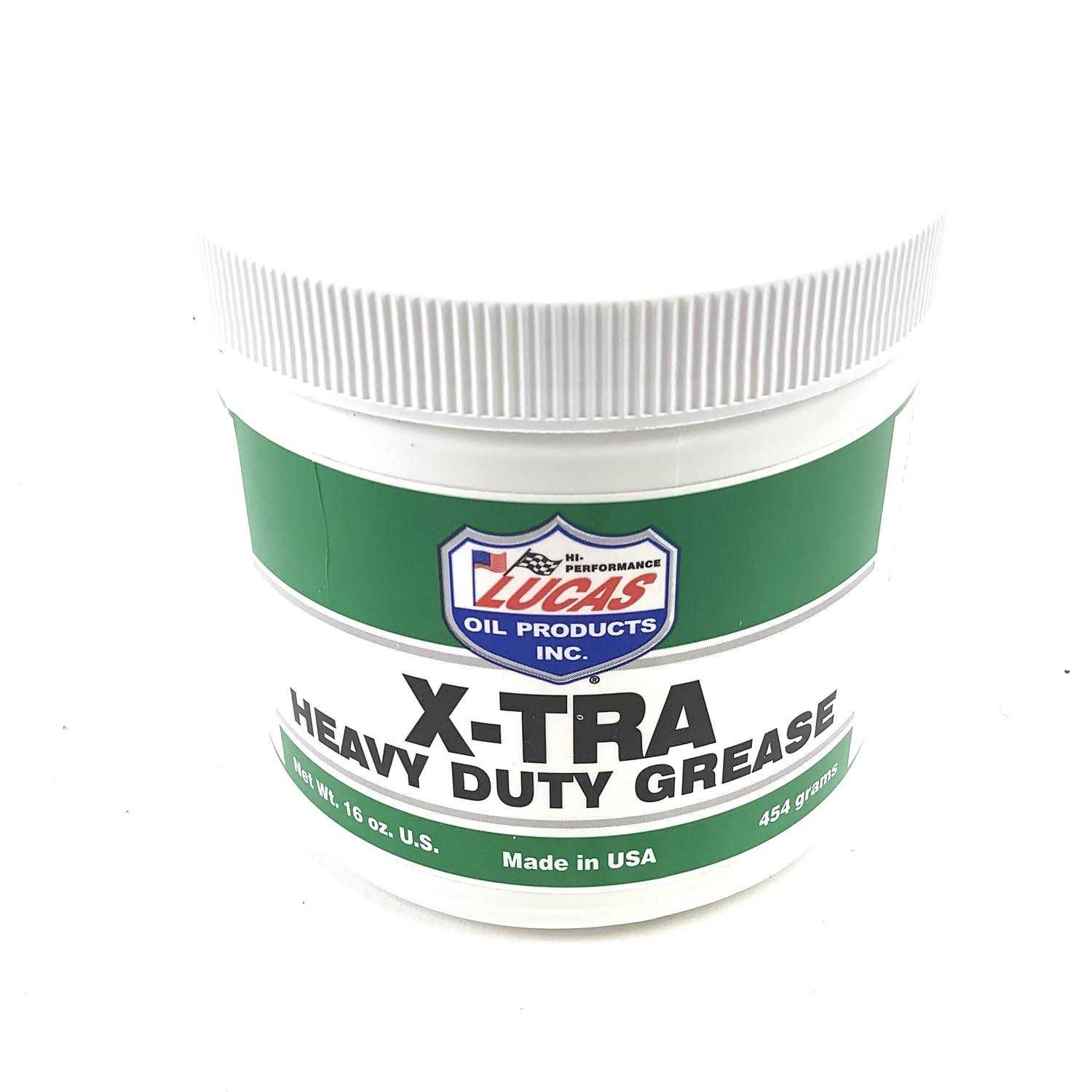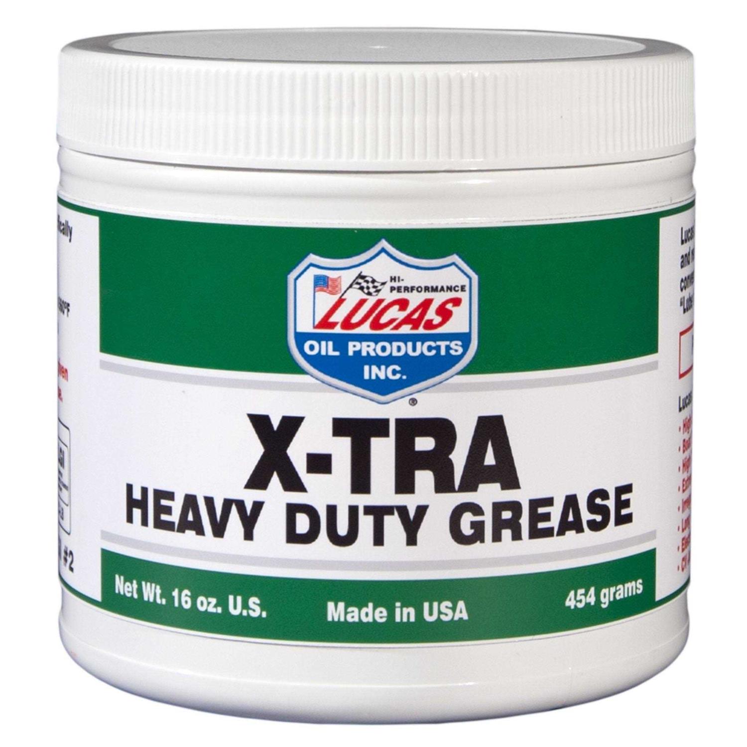 Lasts four times longer than regular grease. Virtually waterproof. All temperature stable. Exceeds lube for life specifications. Ultimate grease for high speed bearings. Virtually wash-out proof. Stands up to high temperatures and stays soft in very low temperatures. EP fortified and exceeds OEM specifications. Lucas X-Tra Heavy Duty Grease was formulated for automotive, agricultural, heavy-duty and industrial applications. It is virtually waterproof and is more stable than all conventional lithium grease. It is fortified with an extreme pressure additive package and it exceeds OEM lube for life specifications.