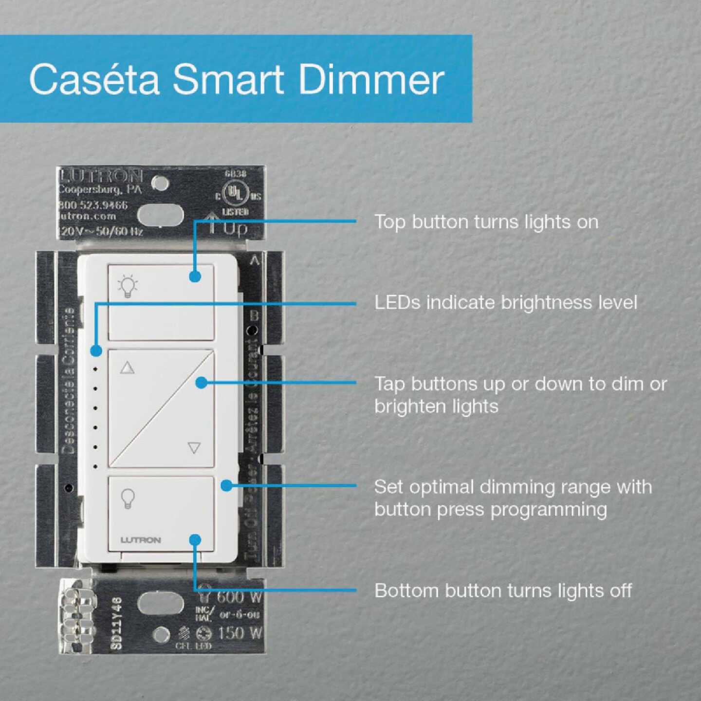 Adjusting lights and shades from a smart phone has never been easier, more reliable, or affordable. Experience the ultimate convenience with the Lutron Caseta Wireless dimmer, Pico remote control and Smart Bridge. The wireless dimmer gives you the ability to set the right light for any activity whether it’s reading, watching TV, entertaining, or having a casual dinner. The dimmer works up to 600 watts of incandescent or halogen and 150 watts of dimmable LED or dimmable CFL. Control the lights from anywhere in the room by using the Pico remote control either in your hand, on a tabletop pedestal (sold separately) or by mounting the remote directly to the wall. You can even use the Pico remote to control the lights from your car as you arrive home. Use the Lutron Smart Bridge and App to control lights and shades from anywhere, schedule them to adjust automatically based on the time of day, or create your favorite scenes that adjust multiple lights and shades with the press of a button. This kit includes one wireless in-wall dimmer, one Pico remote control, one coordinating screwless wallplate and one Lutron Smart Bridge.