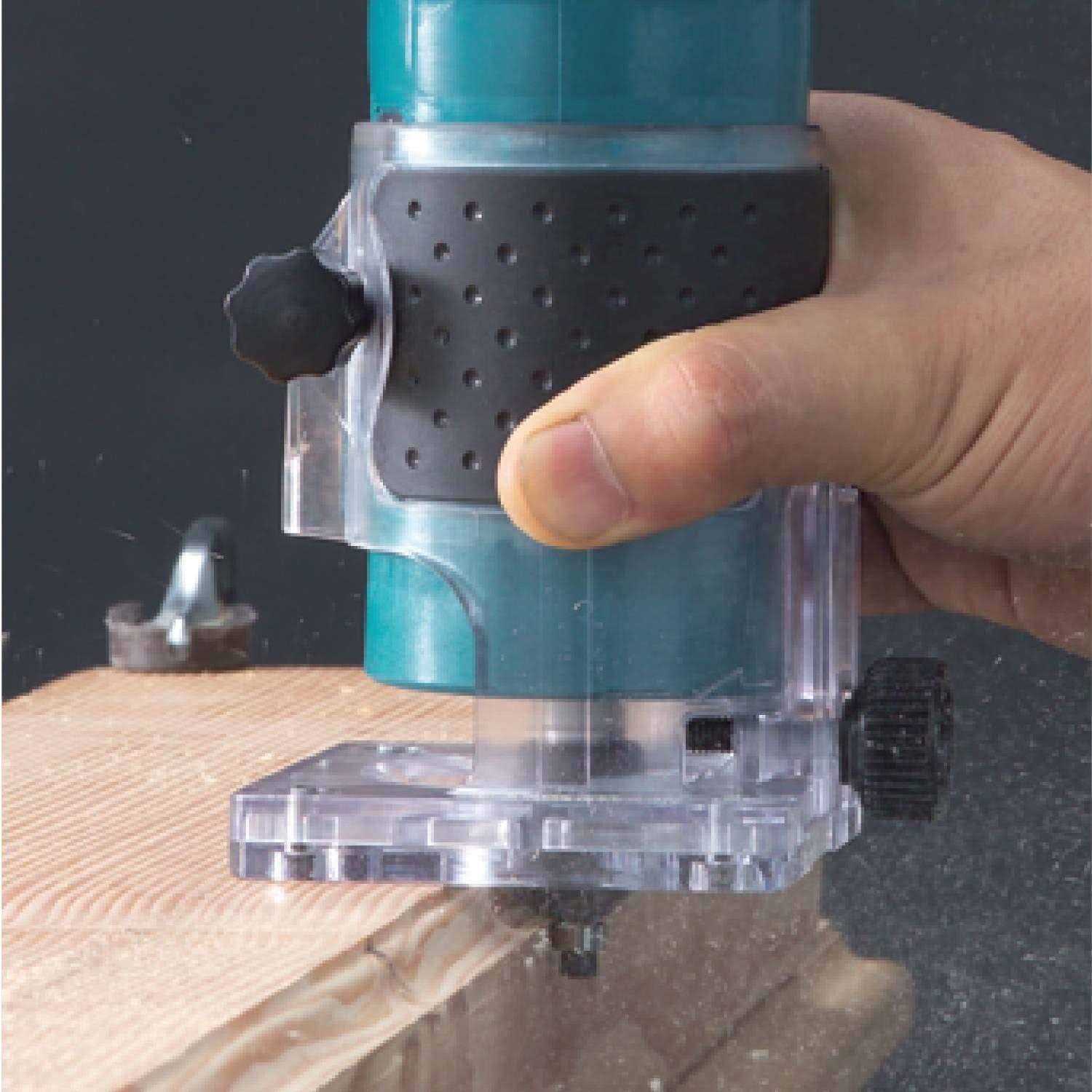Powerful edge routerThis Makita edge router is ideal for milling laminated woods and veneer wood. The milling depth can be precisely adjusted and locked. The foot of the edge router is easy to adjust and because it is transparent, you always have a good view of the workpiece.SpecificationsThe maximum plunge depth of the cutter is 35 millimeters and the diameter of the shank is 6-6.35 millimeters. Good results are guaranteed with the high-speed motor. In addition, a copy ring, trimming guide, collet and other operating tools are also included.
