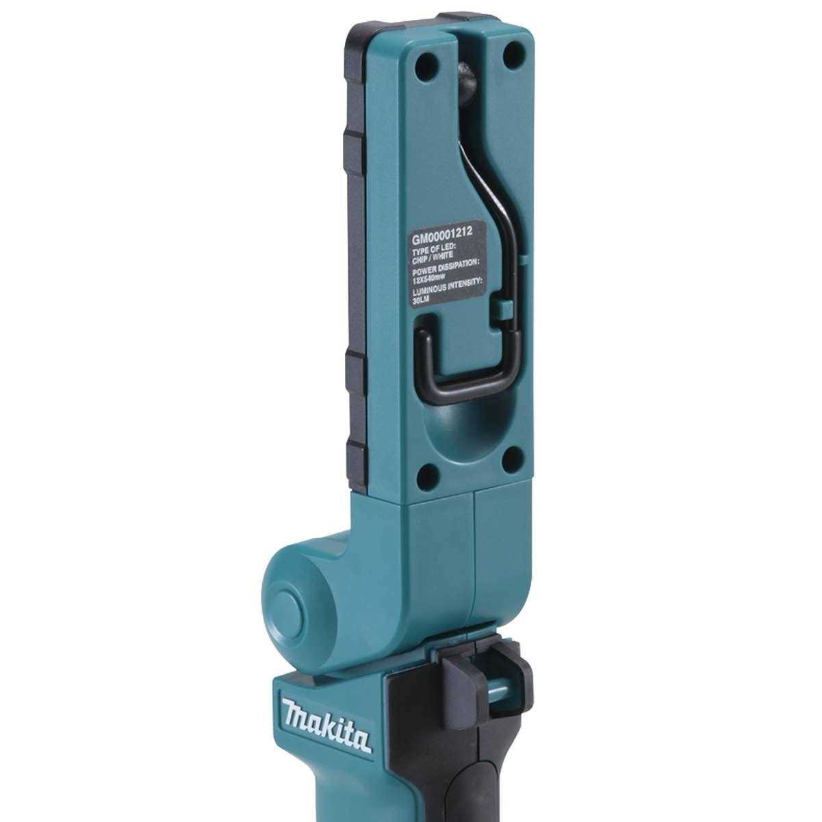 At full brightness 12 LED it provides 240 lm of light. The two-mode switch also provides a half-brightness setting with 6 LED 120 lm. When using the fast-charging 18V LXT Lithium-Ion 3. 0 Ah battery sold separately the flashlight delivers 12 hours of continuous illumination on a single charge on the full brightness/12 LED setting and 22 hours on the half brightness/6 LED setting. The flashlight can be powered by Makita 18V Lithium-Ion batteries. For added convenience the flashlight head folds up and down and pivots left to right to deliver multiple lighting angles. A metal hang-hook swivels 360-degrees and folds away when not in use. The flashlight has a slim compact design at 15 In. L and weighs only 2. 1 lbs. with 18V LXT battery sold separately. Its part of Makita’s expanding 18V Lithium-Ion series the worlds largest cordless tool line-up powered by an 18V Lithium-Ion slide-style battery. Makita 18V Lithium-Ion batteries have the fastest charge times in their categories so they spend more time working and less time sitting on the charger.