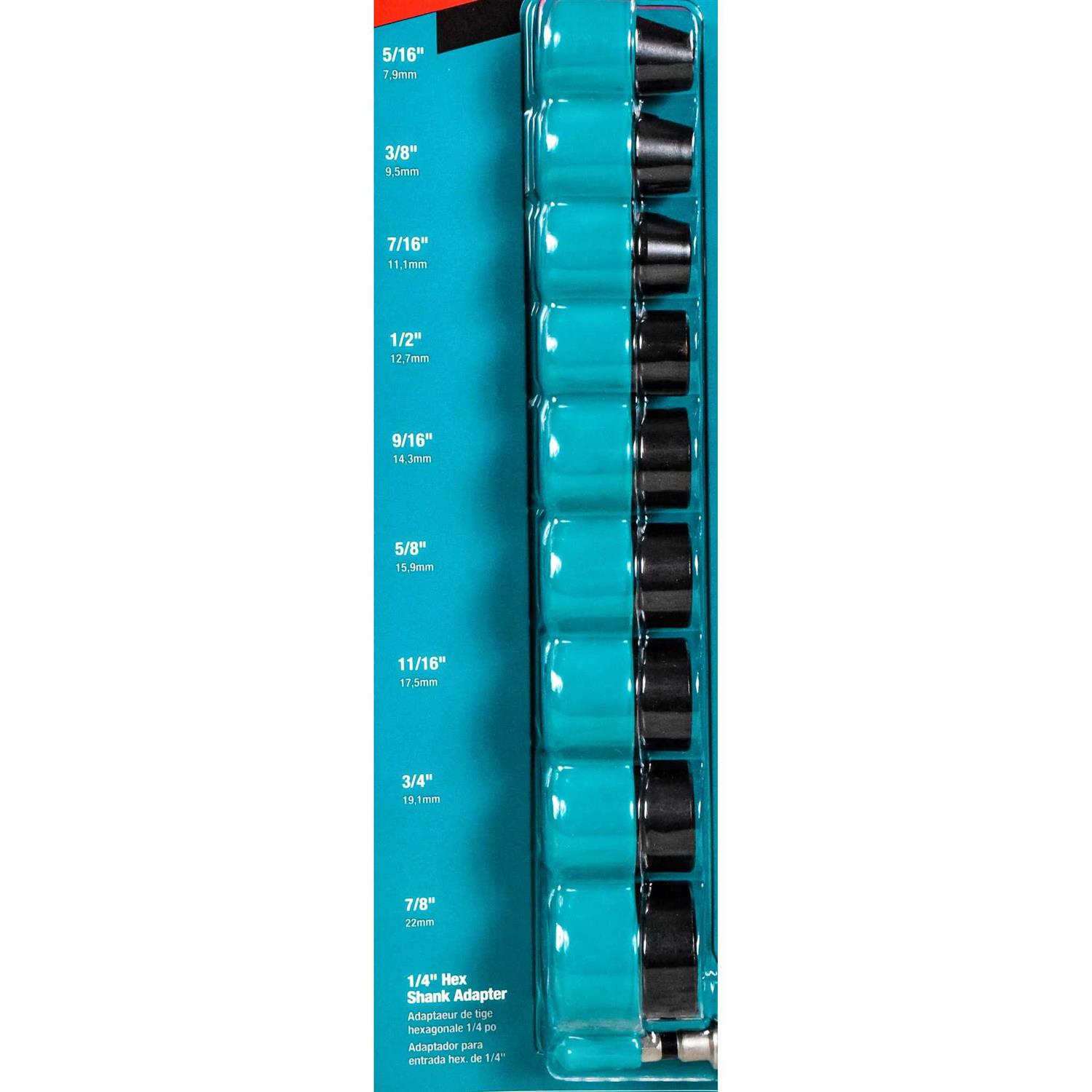 Star Drive by Makita. Details:The Impact XPS 10 Piece 3/8″ Drive 6-Point SAE Impact Socket Set features high-strength 6 point sockets designed to be used with impact drivers, impact wrenches and ratchets. Sockets are made from heat-treated alloy steel with a black oxide coating to resist corrosion for longer life. Impact XPS 6-point drive sockets are engineered for extreme torque applications. The socket set includes a standard socket adapter and a flexible boot that makes storage convenient for both the adapter and the sockets.