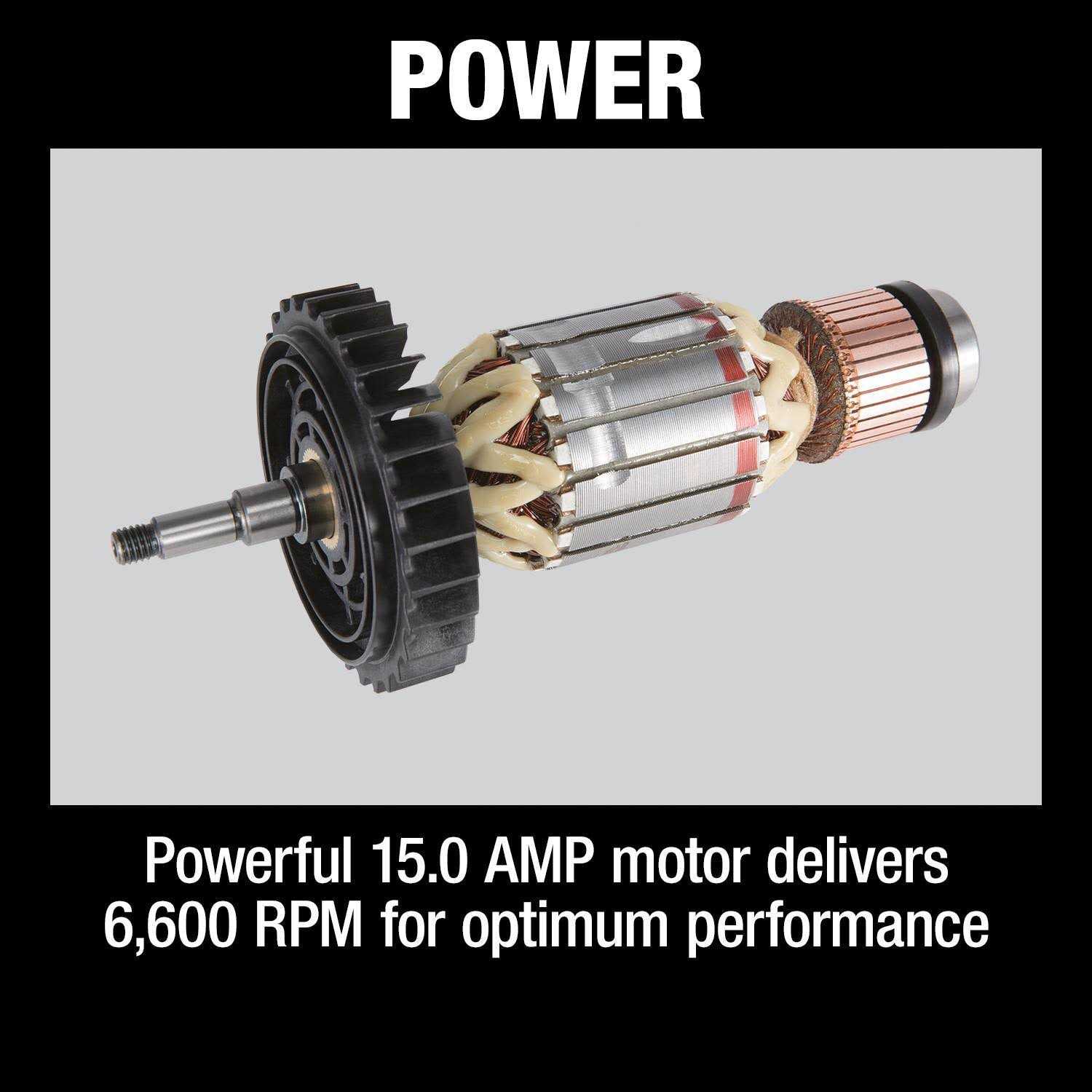 - Powerful 15.0 AMP motor delivers 6,600 RPM for optimum durability and performance