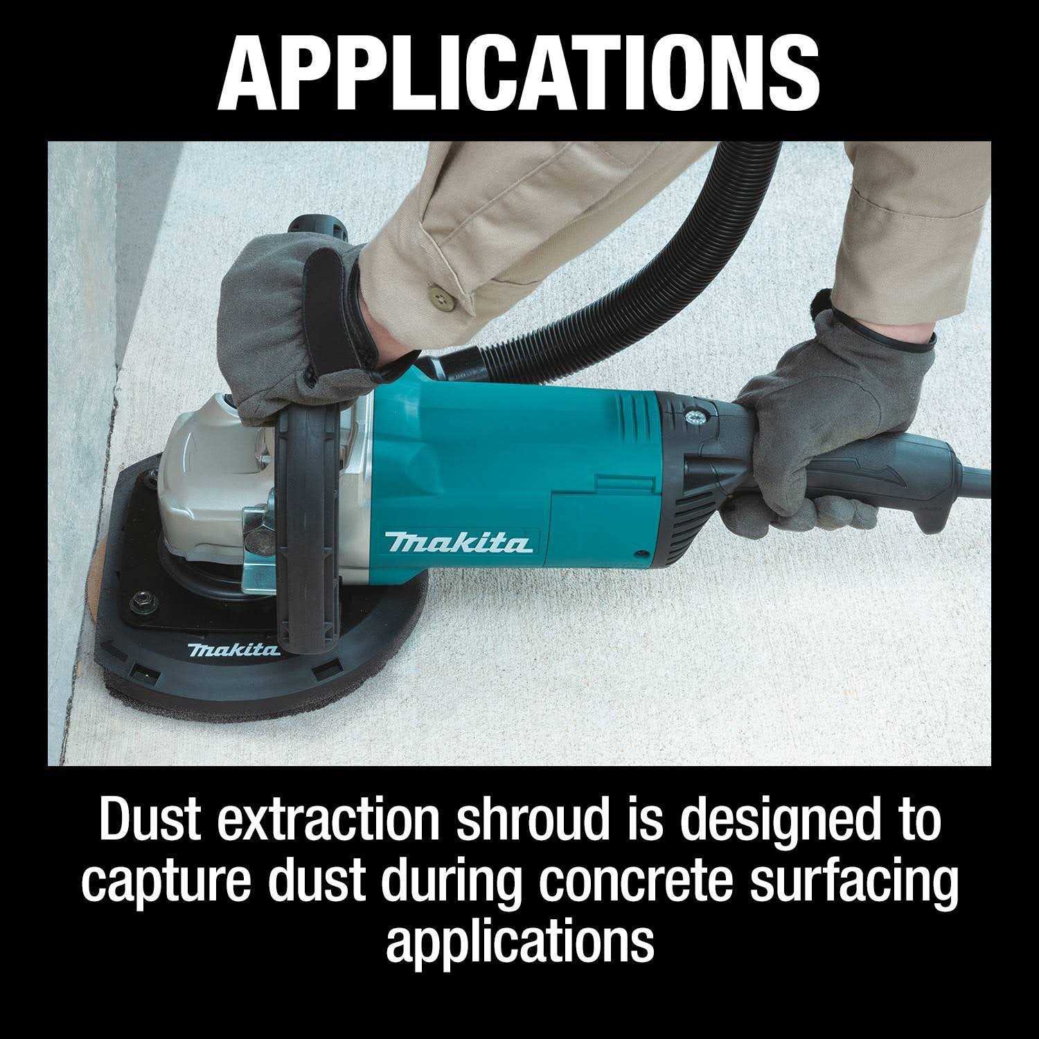 - Dust extraction shroud is designed to capture dust during concrete surfacing applications