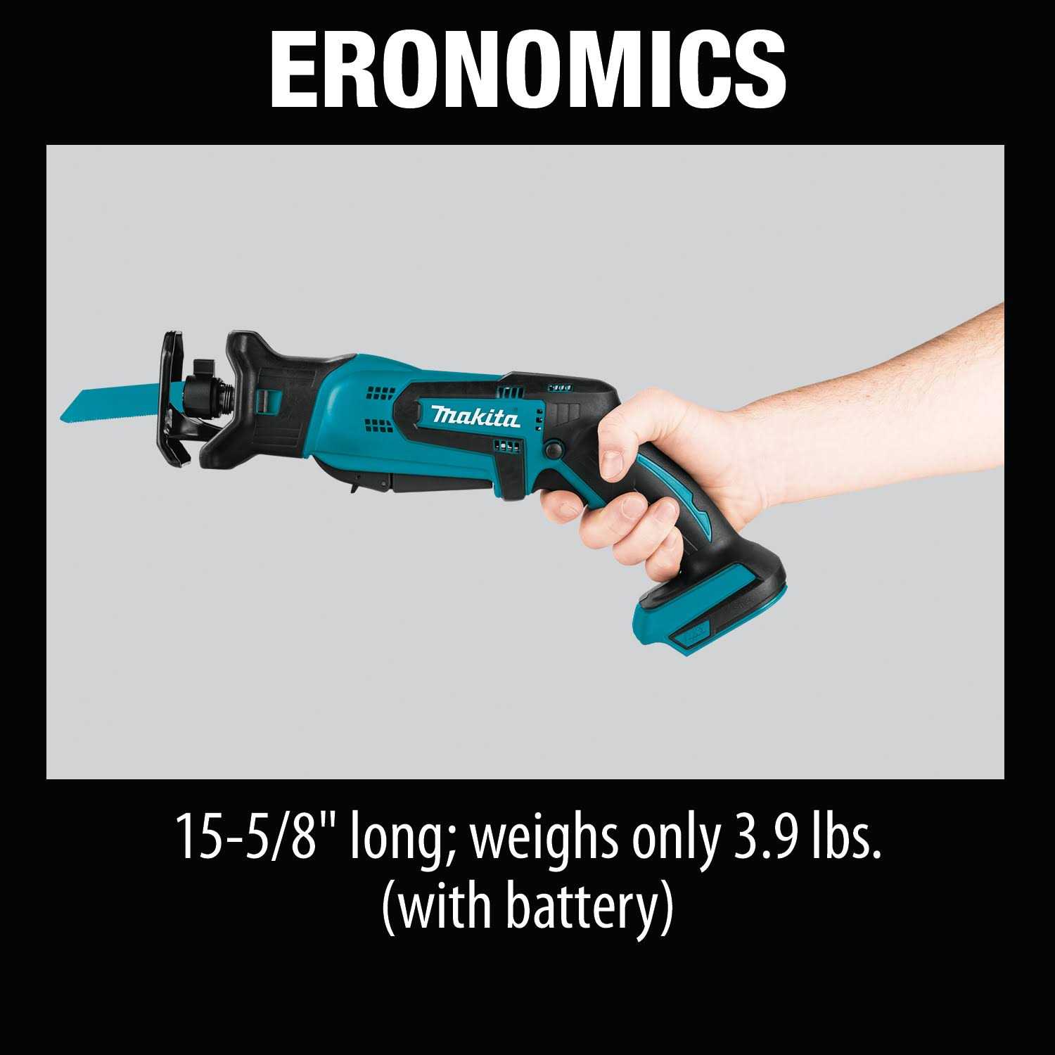 The variable speed motor matches your lithium-ion reciprocating saw to any material, with a dual-position switch that’s accessible as either a paddle or trigger for extended work. The blade changing system is tool-less for shorter maintenance, and the 15-5/8-inch size and 3.9-pound weight make it easy to use on any job site. A soft-grip comfort handle gives your Makita 18V LXT reciprocating saw the staying power to finish the longest jobs, and a front-mounted LED illuminates the cutting area to ensure straight, smooth cuts on each stroke. The motor is protected by Makita’s STAR Protection Computer Controls and the LXT design reduces battery draw through efficient motor technology. The Rapid Optimum Charger (not included) can recharge the tool’s 18V batteries (also sold separately) in as little as 30 minutes.