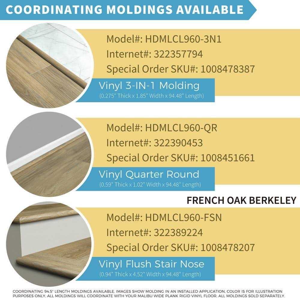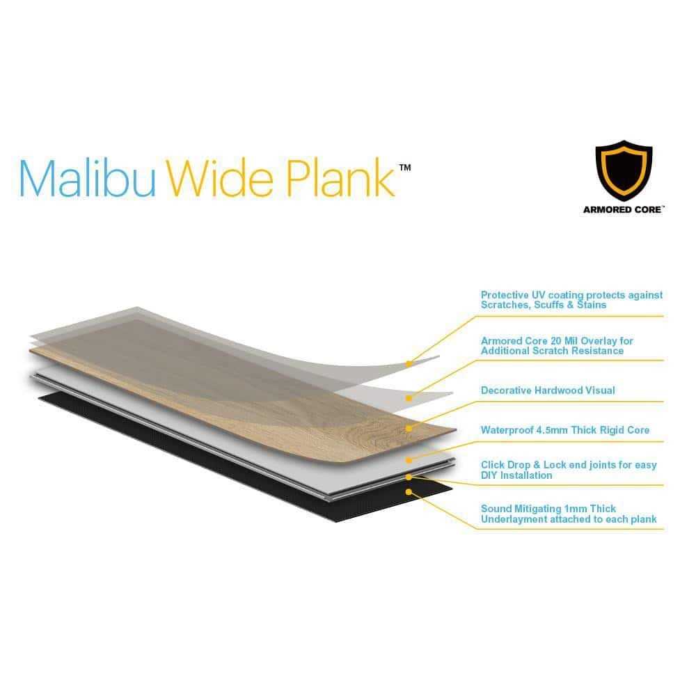 Welcome to the most beautiful and durable Waterproof Rigid Core Vinyl Flooring: Malibu Wide Plank Designer Rigid Core with ArmorCore Technology. Our Lux Series French Oak Collection offers beauty, protection and performance at a price within reach. These gorgeous 9.13 in. wide and 60 in. length planks have perfect clarity and enhanced grain definition with an embossed hardwood surface texture with each plank featuring micro-bevel edges and ends. Installation on, above, or below grade is easy for either DIY or pro click lock installation for simple and quick projects in your kitchen, living room, bathrooms, bedrooms or basement. Each plank features a 1mm thick pre-attached underlayment for a floor that is durable, quiet, comfortable, and warm to walk on. This collection features exceptional on trend color tones to suit any decor from traditional to modern. The days of worrying about water damage are over as these floors are 100% waterproof. These durable floors resist scratches, dents and staining, are very easy to clean and maintain and will perform exceptionally well in homes with Kids and Pets. Waterproof Rigid Planks with Scratch, Stain, and Slip Resistance Attached 1mm underlayment offers an easy DIY click lock install FloorScore Certified with durable 20mil low-gloss wear layer Embossed; low gloss; authentic hardwood surface visuals 5.5 mm thickness x 9.13 in. width x 60 in. length, wear layer thickness is 20 mil 100% waterproof and water resistant; can be installed in all rooms – Above, On or Below grade Can be installed over most existing surfaces including tile, wood, concrete and vinyl Residential and commercial use Easy maintenance; simply clean with a dust mop, vacuum, or damp mop Don’t forget your coordinating trim and moldings 3-in-1 reducer/T-mold/end-cap; quarter round, or flush stair nose 1mm thick pre-attached underlayment included for a floor that is durable, quiet, comfortable, and warm to walk on Drop lock installation system that is fast and easy for DIYers and pros to install No acclimation required; you can install right away For use indoors and in temperature-controlled environments only Premium armored core technology provides better stability and overall performance and hides subfloor imperfections 30.45 sq. ft. per case; 8 planks per case; case weight is 58.64 lbs. Flooring or sample color may vary from screen representation; recommended to order a sample and view it in room where flooring will be installed Add texture to your hardwood flooring with the addition of this Malibu Wide Plank French Oak W Berkeley Rigid Core Click Lock Luxury Vinyl Plank Flooring.