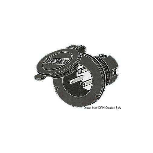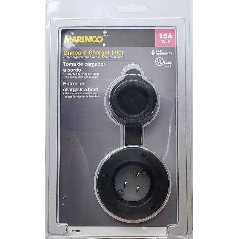 The MARINCO On-Board Charger Inlet makes battery charging through an on-board battery charger safer and more convenient. The inlet mounts on the boats exterior and is hard wired directly to the charger. Just open the flip lid cover and plug an extension cord into the inlet to bring charging power to the boats batteries. All of the hatches remain closed and locked throughout the charging cycle, adding convenience and security for the boater.