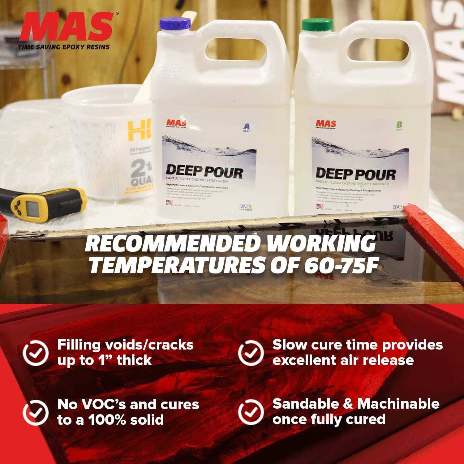 MAS Deep Pour Epoxy is specifically designed for molding encapsulating and creating deep pour castings such as those used on live edge river tables and ocean tables. It cures slowly to a clear glass-like finish that resists scratching and yellowing. The extended gel time minimizes exotherm and improves air release for the clearest possible results. For ocean and river tables MAS Deep Pour is the epoxy resin to reach for. Features: Maximum casting thickness per pour is 1/2” to 1” at 70 F subject to multiple variables consult the instructions for more infoThicker castings can be achieved with multiple poursImproved air release for minimal air bubblesCan be sanded and machined after 24-48 hours Two-component system composed of 100% solids with a 3: 1 by volume mix ratio IMPORTANT NOTE: This is an advanced deep pour epoxy resin system. DO NOT use Deep Pour Resin in working temperatures above 75#176;F. Pouring too much epoxy into a large area may result in shrinking yellowing or cracking. Prior to using Deep Pour Epoxy it is recommended that you seal any wood or porous surfaces with Penetrating Epoxy Sealer #60727 sold separately. This will reduce the risk of air bubbles and foam during cure.