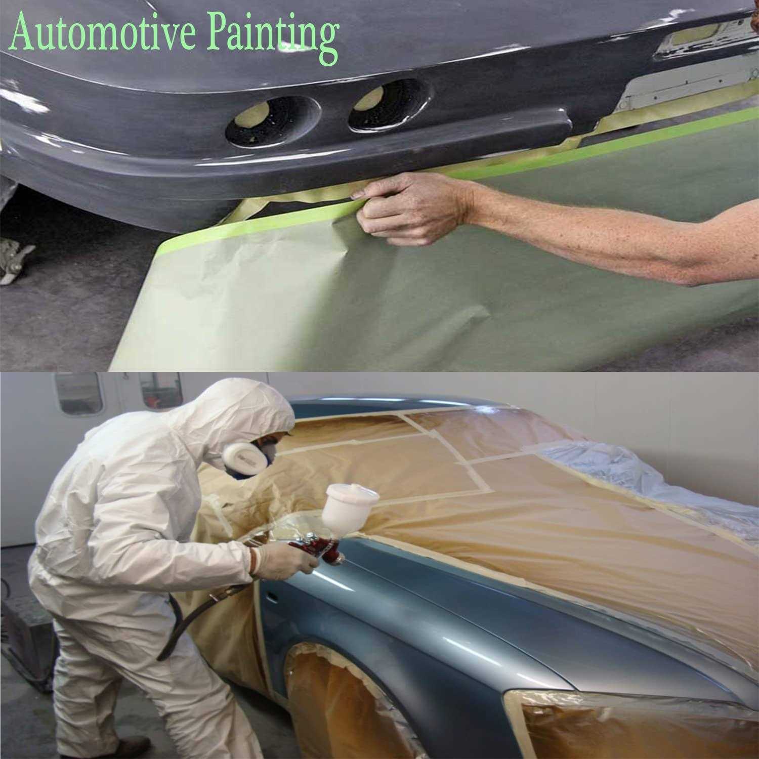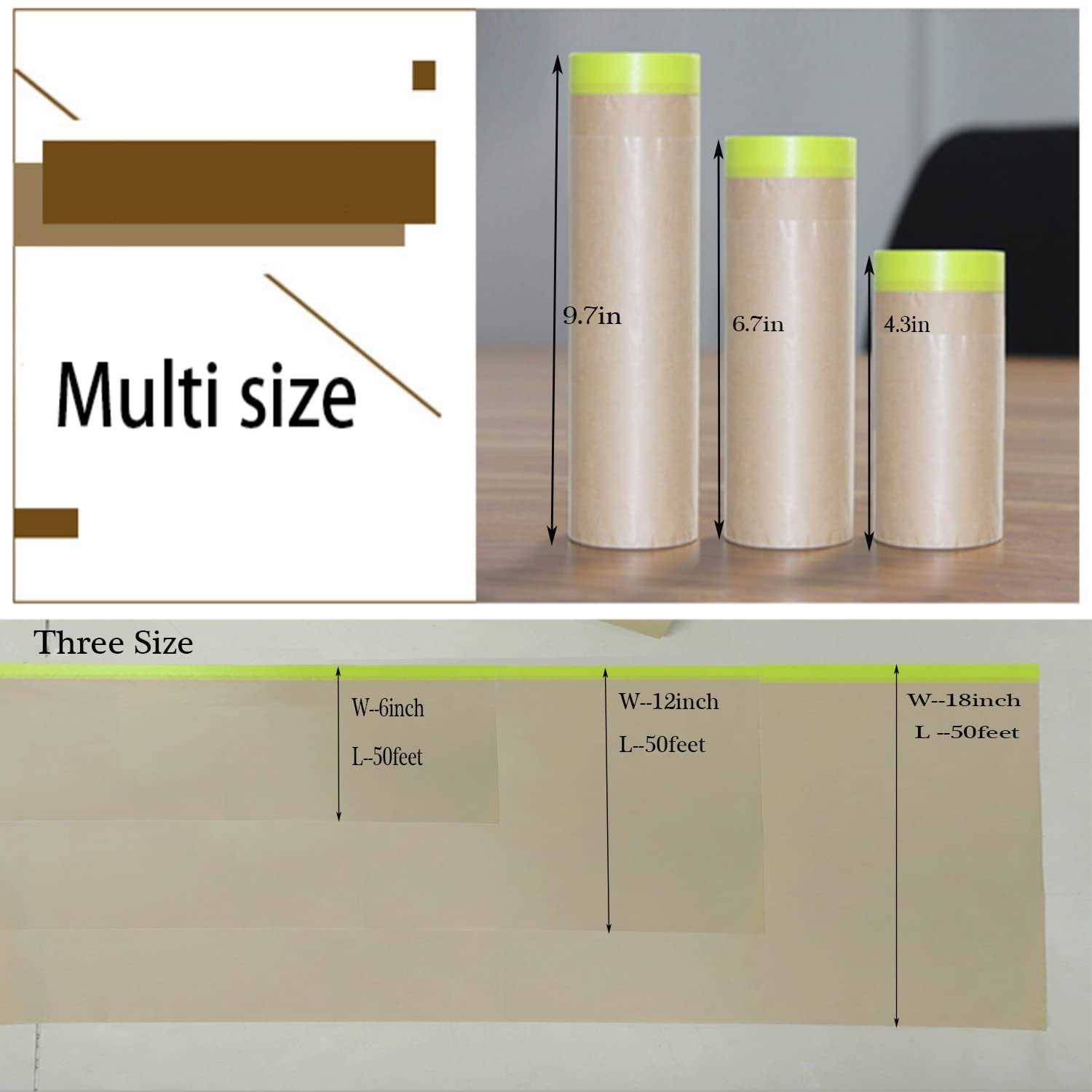 Each masking paper roll measures 50ft long, different sizes and decent length enough to meet your various needs. Self-Adhesive Function- Spray paint masking paper lightweight and tear resistant, it can be freely attached to the surface of objects such as the automotive body, furniture and the wall surface to ensure complete protection. this paint paper auto featuring premium adhesive which can be easily removed with no residue left behind, no need to worry about cleaning up sticky spots on walls after painting or on items that you have labeled. High-quality materials – Kraft paper material makes the paint dry quickly without splashing and flowing, Ideal for automotive painting, equipment coverage and appliance protection, Since paper is biodegradable, it is a more environmentally friendly material compared to plastic masking films. Pre-Taped Masking Paper – Roll design for quick and convenient unfold and cover various small appliance. You can cut paint protection paper tape of different lengths according to different items, meet your needs. Versatile & Protective – The paint masking paper can shield and protect household appliances and furniture from pigment, paints and moisture during house decorating or painting. auto masking paper is ideal for general purpose automotive applications, equipment coverage, household appliances, furniture, floors, walls, vehicles, cabinets, countertops, arts and crafts and residential and commercial paint projects. Pre-taped Masking Paper for Painting Pre-taped masking paper is kind of “”2 in 1 masking paper””, classic painters paper and self-adhesive masking tape combined together. The self-adhesive tape is directly attached along one side of a large folded sheet of paper and easily attaches to the wall or any other surfaces. It helps to achieve a perfect paint job with precisely defined color edges while the paper effectively protects the floor and furniture from any accidental paint splashes. Kraft paper and masking tape together, mask quickly and easily with one action, save your time in painting Strong, non-absorbent, tear resistance kraft paper protects surfaces for both water and solvent based paint Easy to apply, tears easily by hand, no no scissors, hand masker or other tools needed, but still match with masking film dispenseri”