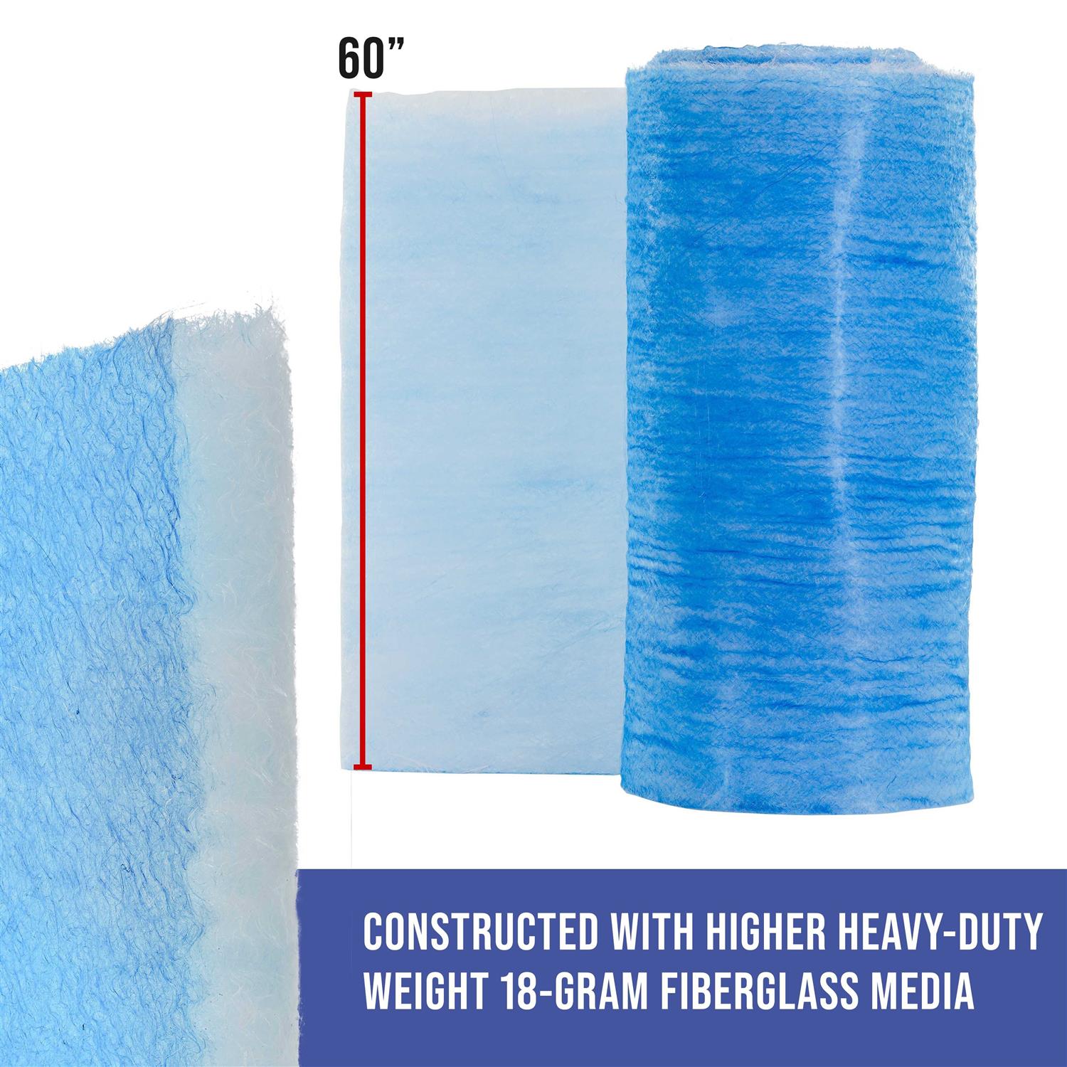 The standard style of exhaust paint arrestor filter roll that fits into many crossdraft and downdraft automotive and industrial paint spray booth exhaust systems. Highly effective blue exhaust paint arrestor filter roll constructed with higher heavy-duty weight 18-gram fiberglass media provides superior paint trapping and filtering performance. High-performance exhaust filter roll that exceeds the EPA Title 40 CFR Part 63 98% Efficiency Rule. A premium filter roll with an extreme capacity to trap overspray paint particles. These highly efficient filters are the best defense to prevent paint particles from building up on spray booth exhaust fans and ducts.