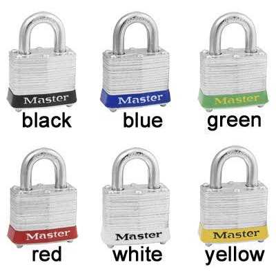 Master Lock No. 3 safety lockout padlocks have a 1- 9/16-inch (40mm) wide laminated steel body for superior strength. The hardened steel shackle provides extra cut resistance. Key numbers are ink-stamped on the bottom of the lock and the bumpers are colored for easy identification.