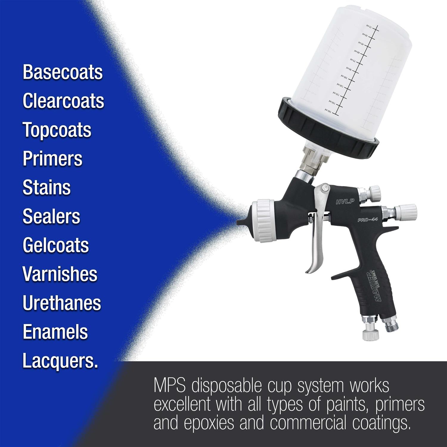 Kit includes 50 cup liners with a 6 ounce (180ml) fluid capacity, 50 lids with built-in 125-micron fluid strainers, 1 hard cup with retainer ring and 20 cup sealing plugs. The MPS disposable spray gun cup system’s outer hard cup connectors are compatible to work with, and twist-lock onto original styles of spray gun adapters, not 2.0 style. The proper adapter will allow you to use the MPS disposable cup system with almost any brand of spray guns. Master Pro 22 Series Touch Up Spray Gun Models require the MAS MPS-882 spray gun adapter. Master Pro 33, 44 & 88 Series HVLP Spray Gun Models require the MAS MPS-881 spray gun adapter. Master Spray Guns, MPS disposable cup system works excellent with all types of paints, primers, epoxies, and commercial coatings. Use the cup system with automotive paint basecoats, clearcoats, topcoats and primers, as well as with stains, sealers, gel coats, varnishes, urethanes, enamels, and lacquers. Dramatically increase your spraying efficiency and overall productivity by saving time, labor, waste, and money by using the MPS disposable cup system! Reduce your paint material waste and cleaning solvent waste, while at the same time eliminating the cost and labor associated with cleaning traditional metal gun cups and the need for mixing cups and paint cans. Everything you need to achieve incredibly fast and professional paint finishing results. All components of the professional MPS disposable cup systems are available both individually and in sets and kits.