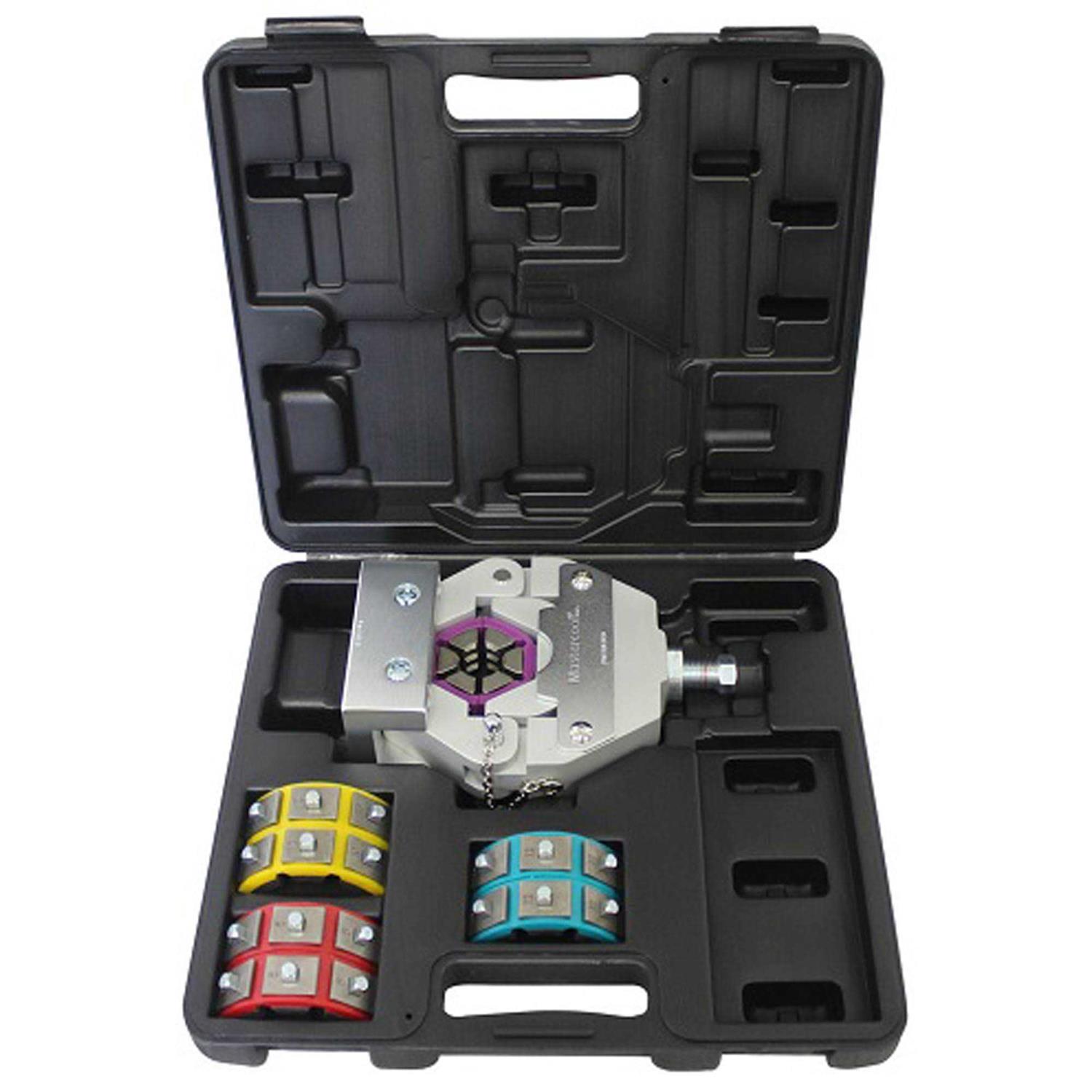 The 71550 is our manual style A/C hose crimper. The dies snap quickly into place requiring no pins or screws. The unit can be easily mounted to a bench using the holding fixture or held securely in a vice. This kit comes with a complete set of dies covering standard hose sizes #6, #8, #10 and #12. (patent # 6,324,884) *Optional reduced barrier sizes are available.