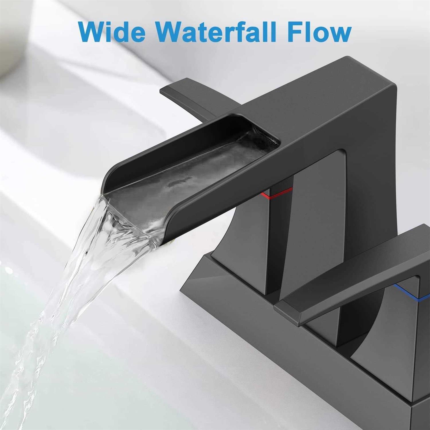 Quality of Bathroom Faucets for Sink 2 or 3 Holes: Hosslly bathroom faucet adopts a Matte Black finished surface and Stainless Steel material which effectively resists corrosion, scratches, and rust in daily use. High-quality ceramic valve core, advanced water control system with lifetime leak-free and maintenance-free performance, these durable valves are not affected by extreme temperatures, sand, rust, and other conditions Quick& Easy install: 4-inch Centerset bathroom faucet design for 2 or 3 hole mount. Hole size:1.1 – 1.38 inches.Max deck thickness: 1.38 inches. Special design of the bathroom basin sink faucet and hose connection, quick connection structure, easy to install by yourself without a plumber Safe and Harmless: Brushed Nickel Bathroom faucet meets CEC, cUPC, and NSF certification requirements in pursuit of a safe environment. Equipped with Stainless Steel pipes to ensure safe water quality; easy to clean, resistant to fingerprints and water stains under any circumstances Elegant Handles& Centerset Design: Two-handle bathroom faucet, double handle for effortless flow and water temperature control; The design of the red and blue rubber ring makes it easier to distinguish between hot and cold water; Gorgeous brushed nickel finished will instantly enhance the appearance of any bathroom sink faucet and complements most decorating styles Waterfall Design and Package: An open trough spout delivers a gentle sheet of laminar water and creates a mini waterfall effect, the flow rate of 1.5 GPM. The waterfall bathroom faucet includes 2 pcs 9/16″ standard water supply lines, 1 pcs stainless steel pop-up drain assembly, 1pcs “Y” shape connect hose 4 inch bathroom faucet matte black