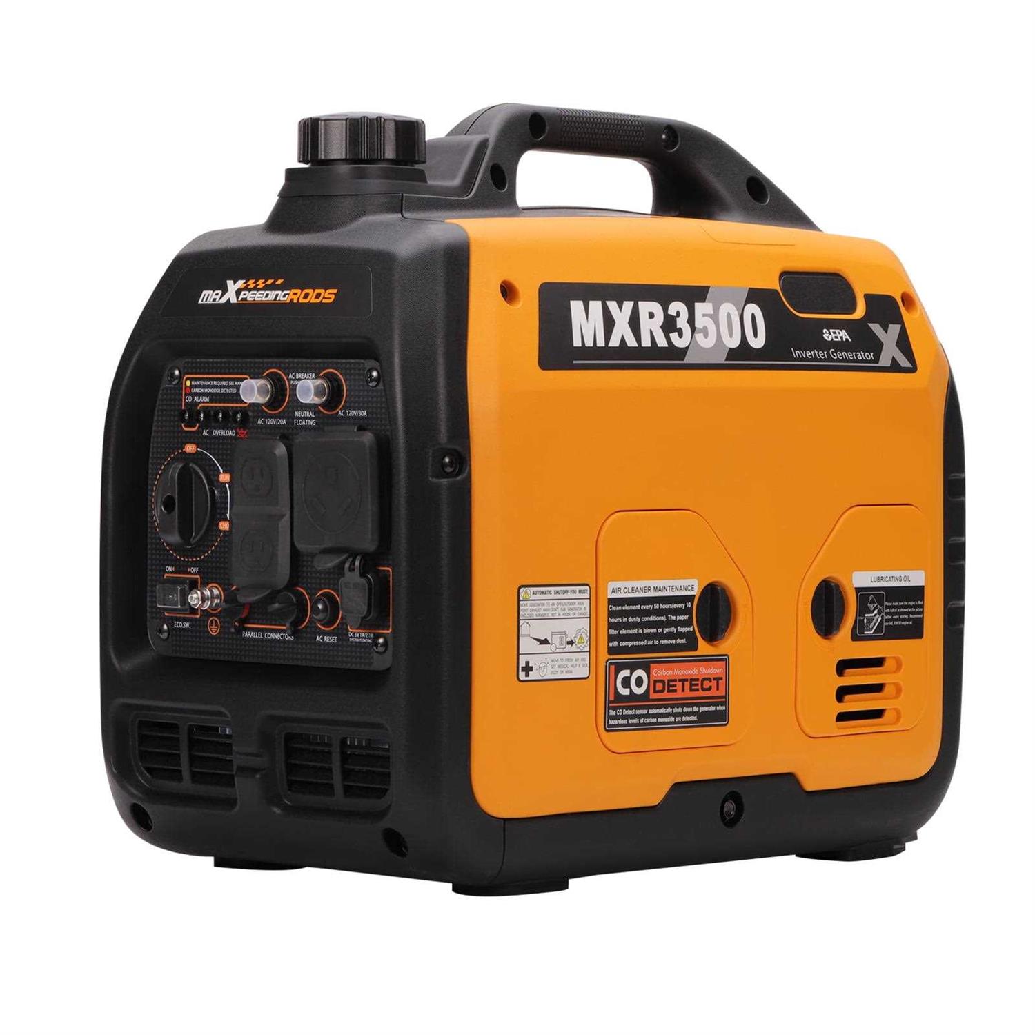 * Due to the emissions standards,this products are Not Leagal in States that follow CARB regulations! * This product is NOT sold to California! NOT sold to California! NOT California! * US version, not fit for UK and Europe Introduction: MXR3500 Quiet Portable Inverter Generator is a nice choice for clean power and optimal portability to charge and run your computer, TV, DVD player, and more. Its single-cylinder, 4-stroke, OHV engine produces 3,500 peaks watts/3,000 running watts of power and generates just 51 dB of sound, making it perfect for quiet camping, RV, and home use, etc. The parallel capability allows you to run two of our generators in tandem with the use of a power kit to effectively increase power output without the hassle that comes along with having a much larger unit. The handy suitcase design is both durable and compact and weighs only 47 lbs, giving you the freedom to take the MXR3500 anywhere with ease Specification: Brand: maXpeedingrods Model: MXR3500 Running Watts: 3000W Peak Watts: 3500W Fuel Type: Gasoline Oil Type: 10W30 Running Amps: 25A Peak Amps: 29.2A AC voltage: 120V AC Frequency: 60hz Noise Level: 58 dB operation Start Type: Recoil Handle Fuel Tank Capacity: 4L(1.06 Gal) Quarter-Load Runtime: 8.3h 50% Load Runtime: 4.5h 100% Load Runtime: 2.5h Engine Displacement: 4-stroke 145cc OHV Generator