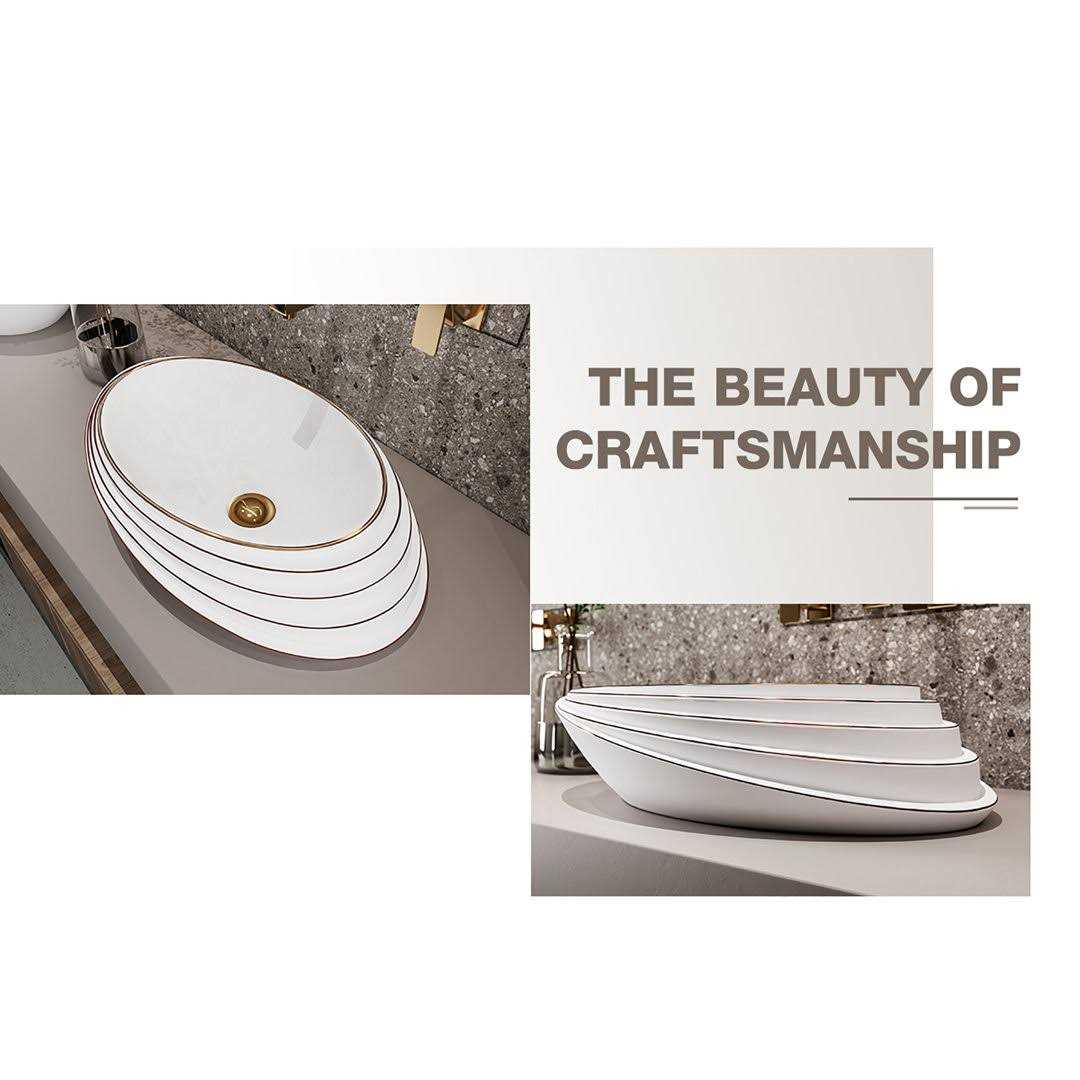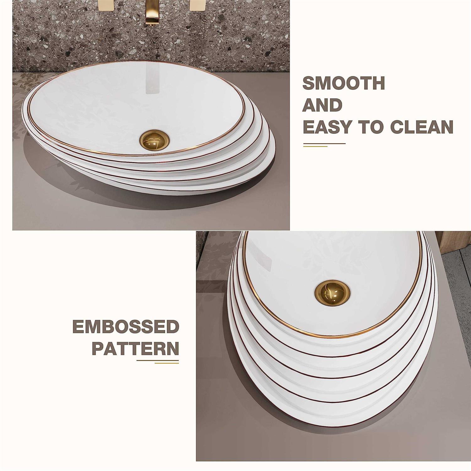 MEJE The Gold Rose Art Sink adds a touch of light luxury and timeless elegance to your bathroom, and is perfectly match with various decoration styles of bathrooms. The embossed vessel sink has no complicated design, simple style but its Unique Slant Oval Shape with Rose Gold Trim make it looks Noble and Elegant, meticulously crafted as a work of art.