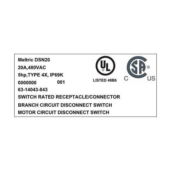 Meltric Decontactor DSN20 Switch rated female receptacle with padlock pawl in blue color is constructed from polyester for long lasting durability. The 3-Pole grounded receptacle accommodates wire of size 14 – 12 AWG. Receptacle has a current rating of 20 Amps, voltage rating of 480 VAC and power rating of 5 hp. Watertight receptacle is perfect for wet situation. It has a short-circuit rating of 100 kilo-Amps. Receptacle has branch circuit rating, motor circuit rating and disconnect switching rating for AC use only. It operates at a temperature of -40 to 140 deg F. It measures 2 Inch diameter x 2.200 Inch x 3.100 Inch x 5.190 Inch. Receptacle is UL listed, CSA certified and meets NEMA, ICE, CE standards.
