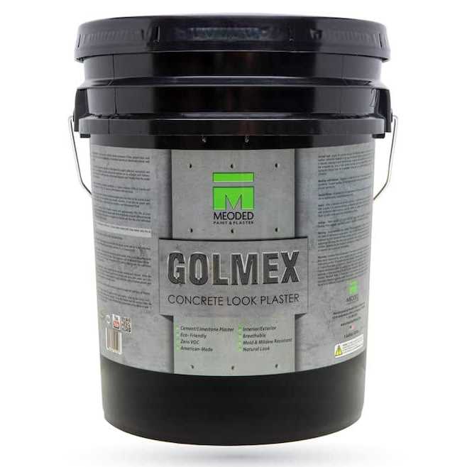 Easy application; apply two layers using a stainless-steel trowel or a spatula to form a durable, decorative finish Versatile; suitable for both interior and exterior surfaces, residential and commercial; can be used to provide a smooth and durable surface on concrete walls or other concrete surfaces Popular and effective for finishing concrete surfaces; to hide imperfections or defects and to enhance the appearance and durability of concrete surfaces Achieve a smooth finish; use the correct tools and techniques to apply the plaster evenly, properly mix the plaster, ensure that the surface is clean and dry, and allow sufficient time for the plaster to dry and set Functional advantages: improve the fire resistance of concrete surfaces, protect the underlying concrete from moisture damage, and enhance the insulation properties of the wall or surface Application: Roll on a layer of Meoded Quartz Primer, then apply a layer of Golmex Concrete Plaster, wait 24 hours for first coat to dry and apply the final layer of Golmex. Lastly, apply 1-2 layers of Meoded Stain Shield Sealer to protect the finish. Meoded Stain Shield is a penetrating natural look sealer that doesn’t change the color, sheen, or texture of the finish. For furthur instructions watch the Golmex Application Video! p Golmex Concrete Look Plaster is a high-quality Portland cement composed of lime, graded silica sand, and admixtures to create the appearance of polished concrete on interior and exterior wall surfaces. Golmex’s pre-mixed dry powder substrate is formulated for superb adhesion and is a popular choice for finishing concrete surfaces due to its durability, versatility, and decorative potential. A wide range of textures can be achieved with Golmex, including the natural look of concrete and a variety of textured designs. – br p Warning: /b Avoid extended skin contact. Use eye protection and breathing apparatus when sanding material. Keep the room well-ventilated when working indoors. /p