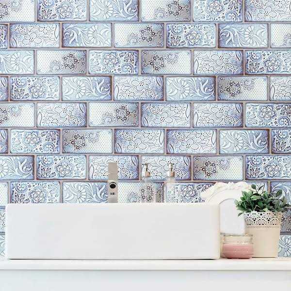 These embossed floral subway tiles feature uneven edges for a handmade look. There are up to four varieties of unique floral and lace patterns for endless design possibilities. The unique pastel coloring, which features varying shades of light blues and gradually darkens to periwinkle and brown around the edges, creates a rustic look. These glossy tiles feature a bisque finish that shows the red ceramic mixed with dark blue on the raised pattern. The reactive glaze on this tile makes every piece unique, so you will never have two that are exactly the same. This reactive glazing technique may cause high variation between dye lots. Use these subway tiles as an accent with many of our other products, including those in the Antic collection, to complete an elegant look.