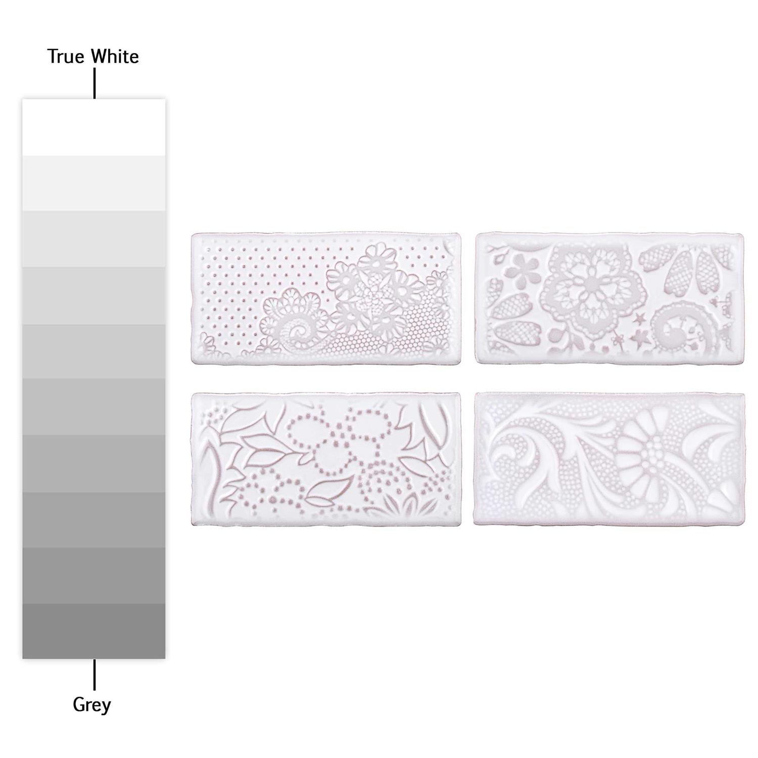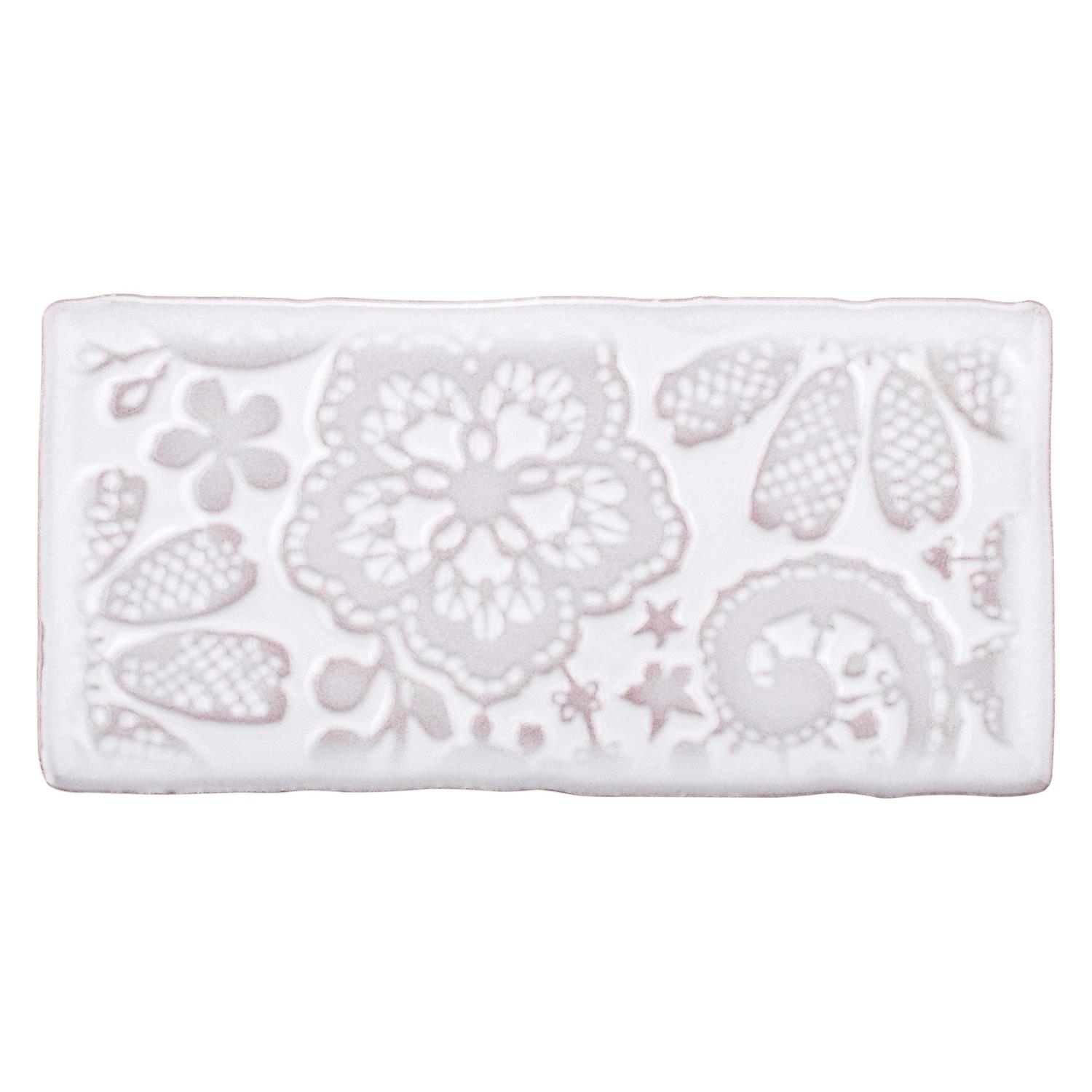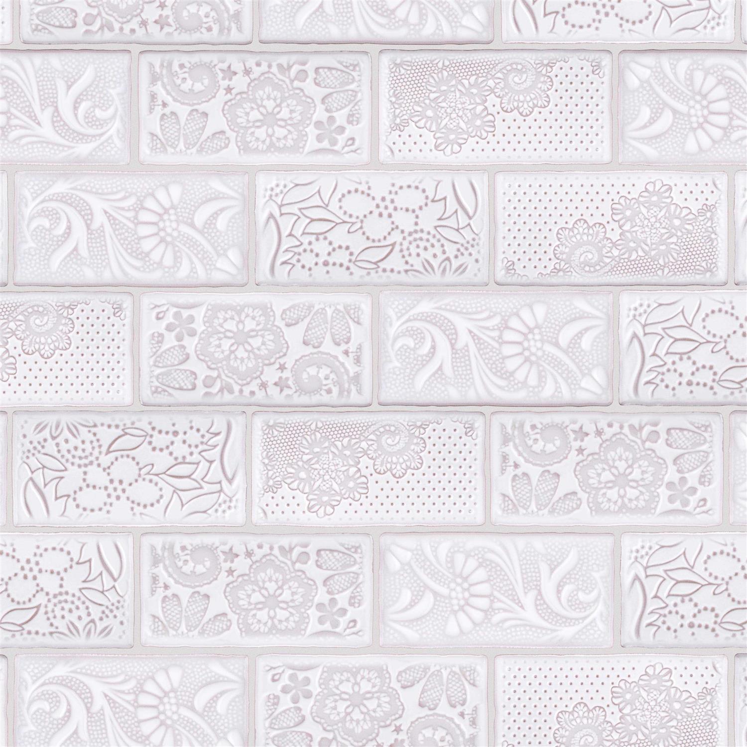 These embossed floral subway tiles feature uneven edges for a handmade look. There are up to four varieties of unique floral and lace patterns randomly assorted within the pack for endless design possibilities. The unique colouring features a milk white colour and a glossy bisque finish that shows the red ceramic on the raised pattern and on the edges. The combination of the satin finish and the visible red clay gives this piece a rustic look. The reactive glaze on this tile makes every piece unique, so you will never have two that are exactly the same. Use these subway tiles as an accent with many of our other products, including those in the Antic collection, to complete an elegant look.